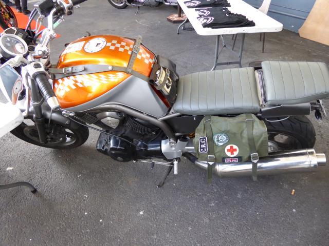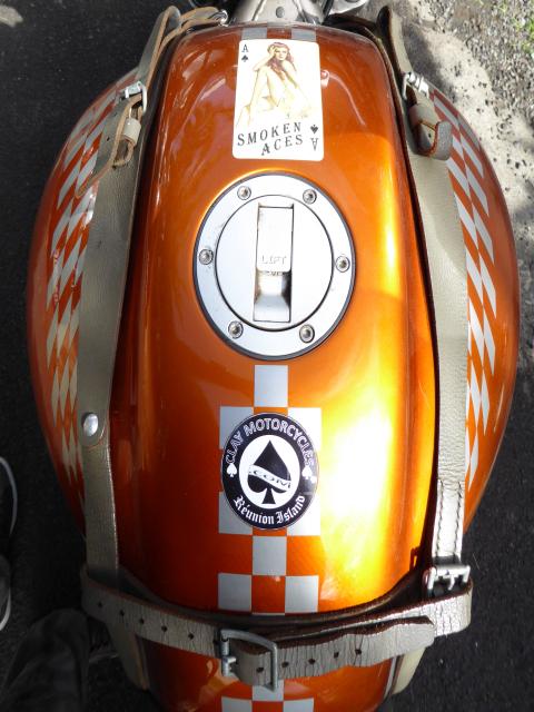 Ensuite, la galerie de photos, prises par un temps exécrable, avec du vent et de la pluie, l’idéal pour présenter un Storm Cruiser. Le pari semble réussi. Les cruisers sont un peu délicats dans les courbes. Le mien se couche désormais comme un cuirassé de poche entre deux creux ! Beaucoup de copains adorent. Surtout, quand Chakal Custom Paint me félicite (sauf pour la peinture à la bombe), ou que Stan sourit en posant ses grosses fesses dessus, je suis aux anges. Merci les amis. Quelques puristes sont restés polis en me disant « Bah! C’est TA moto, c’est l’essentiel! » Ou « En tout cas, elle te ressemble cette bécane, elle est atypique ». Là encore, j’ai pris cela pour ce que c’était: de la bienveillance, un effort d’ouverture, et une assez bonne connaissance de ma façon de vivre notre passion commune: la moto de caractère, sous toutes ses formes. Merci les ami(e)s !