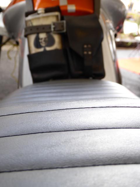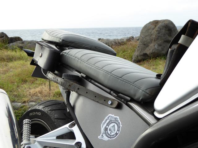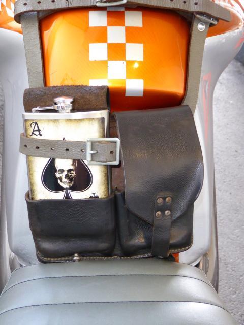 Tout le projet part et atterrit sur la selle. Sans la maîtrise de Matthieu, mon sellier d’art, rien n’était possible. Je lui ai donné deux pièces de bois et de tôle, avec le sysytème d’attache fait main, et une sangle assortie à mon cuir. Il a tout compris, tout interprété, et son travail a fait tout le reste. Pas de Storm Cruiser sans toi mon pote ! Et au Motor Expo, tout le monde venait la caresser, y compris un monsieur qui voulait refaire la sellerie de sa BSA !