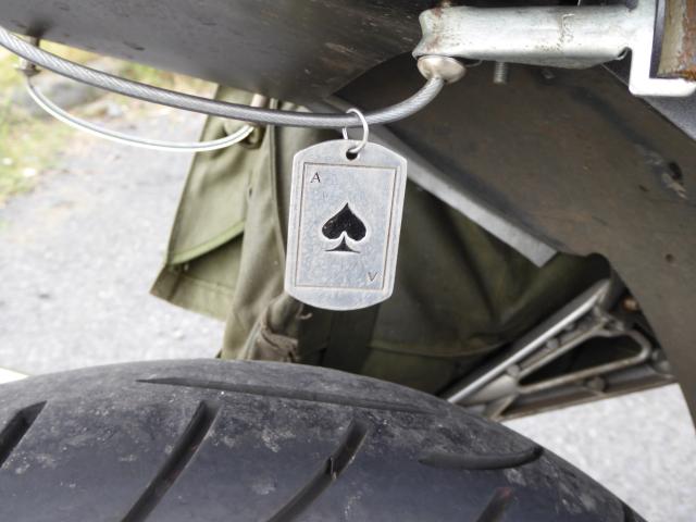Je vous montre un peu l’évolution du labeur, enfermé dans le garage, le soir après le boulot, avec de bonnes lunettes et une lampe frontale. Destruction de tout le plastoc arrière, et suppression de l’énorme cul en alu, mini saute vent en tôle, comme les carters, avec peinture en gris métallisé assorti au cadre. Durits avia devant et derrière. Electricité refaite, nouveaux clikos, nouveaux rétros, protège ligne d’échappement de cross en alu, garde-boue-avant XJR 1300, sangle canibalisées sur sac à dos mili ex RDA, sacoche vintage de l’armée Suisse, cale pieds alus de cross, poignées de soutien passager en cable trouvés au rayon salle de bain, réservoir à…eau pour cacher le ventre du résé avec sa sacoche mili en cuir, pochette latéralle faite sur mesure par un artisan du cuir (pour mettre le futur gilet jaune), phare cat eye en acier, support de plaque et passage de roue en tôle fait maison, etc…