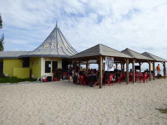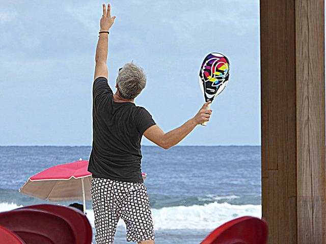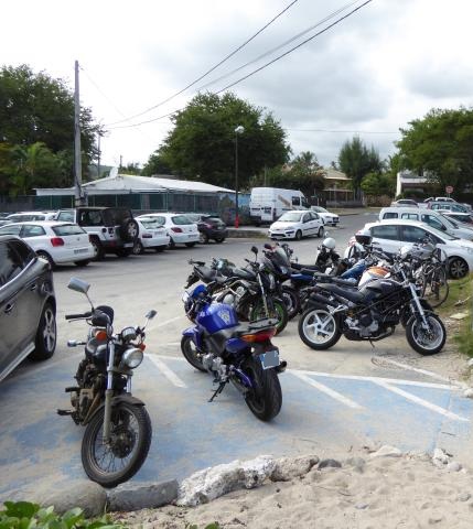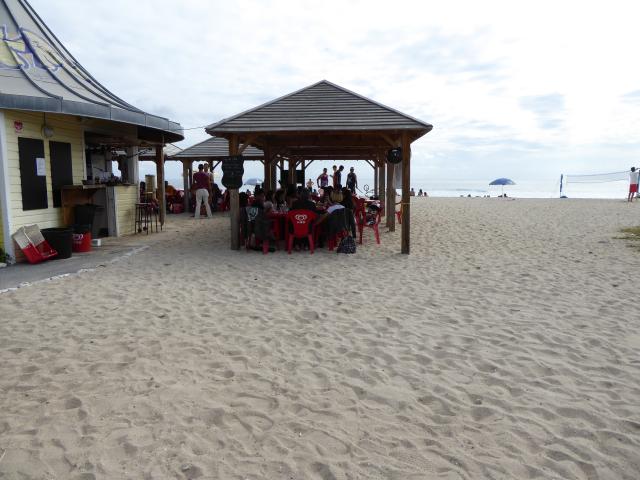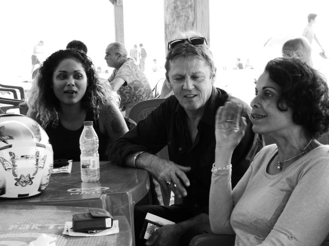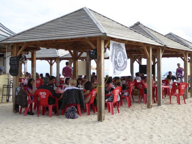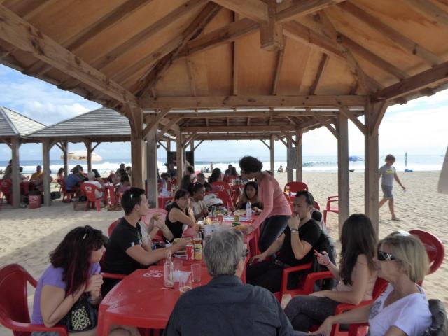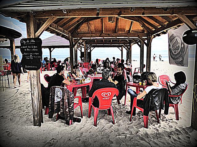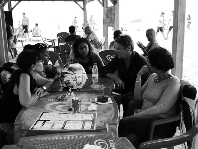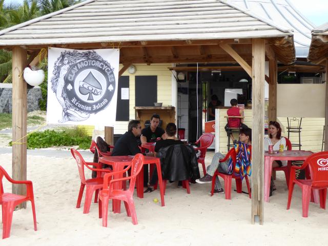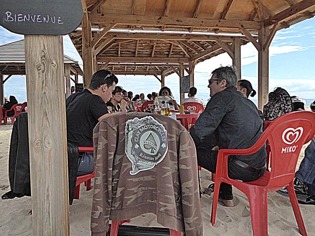 Au final, nous étions une grosse dizaine. Avec une majorité de filles, et pas vraiment des passagères s’il vous plaît. Et force est de constater que c’était juste bien. Des motardes et des motards super cools dans les fauteuils à l’ombre, et des athlètes en tanga qui frappent la balle au soleil : what else ? Pas de pression, pas d’objectif. Juste un bon gueuleton avec les vieux de la vieille et de jeunes nouvelles venues pour parler de la route, des gens qui textent au volant, de ceux qui téléphonent dans leur casque, des mecs, des filles, et de la joie de n’avoir rien de bien particulier à faire. Pas d’activité, pas de compétition, et même pas de balade au programme. Et cela durant cinq heures d’affilé. Ensuite, certains ont repris la route, d’autres sont allés boire un verre au bord d’une piscine, ou pour certaines ont profité du farniente pour s’étaler sur le sable. Ambiance…