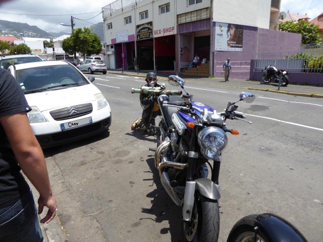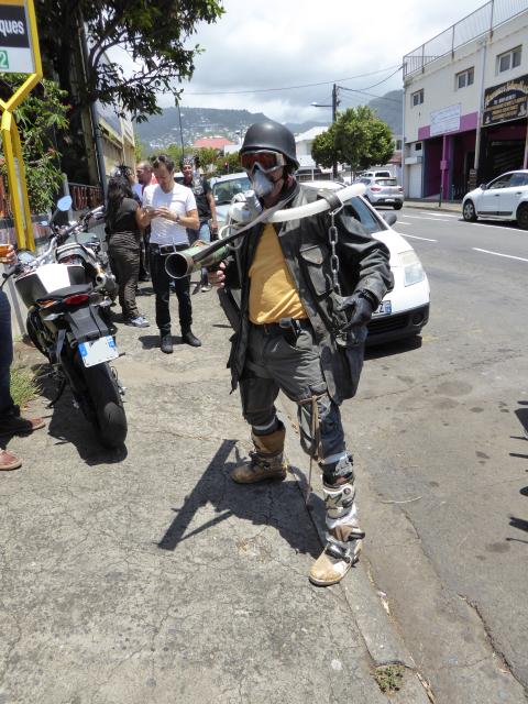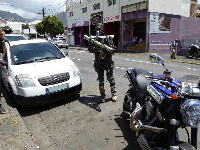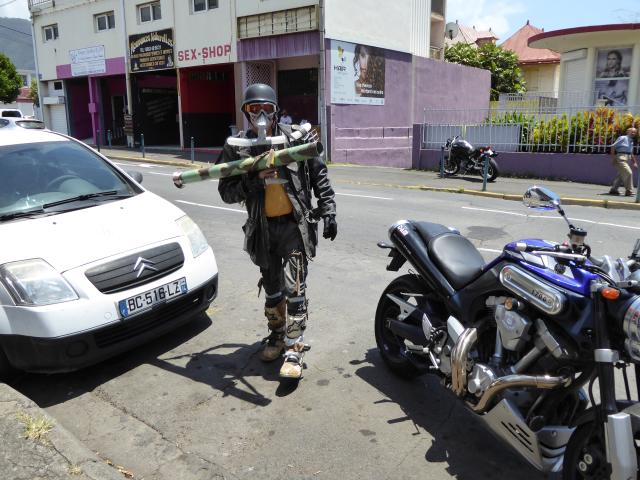 Bon, je m’étais déguisé, et j’avais acheté des tonnes de bretzels, de cahouettes et de chips. Avec mon sac à dos énorme rempli de tout le matos événementiel Claymotorcycles, je sillonnais la bonne ville de St Denis sous un soleil implacable, et les gens ne me regardaient pas. Ou, plus exactement, ils détournaient le regard. Sur la route, un lascar m’avait klaxonné sur son scooter en plastoc parce que je l’avais empêché de me doubler par la bande. A vrai dire, je n’avais même pas remarqué le moustique. Quand je me suis retourné en hurlant « C’est quoi le problème? », il a vu mon masque de paint ball et a vite grillé le feu rouge. Bref, la routine de tout bon apéro qui se respecte.