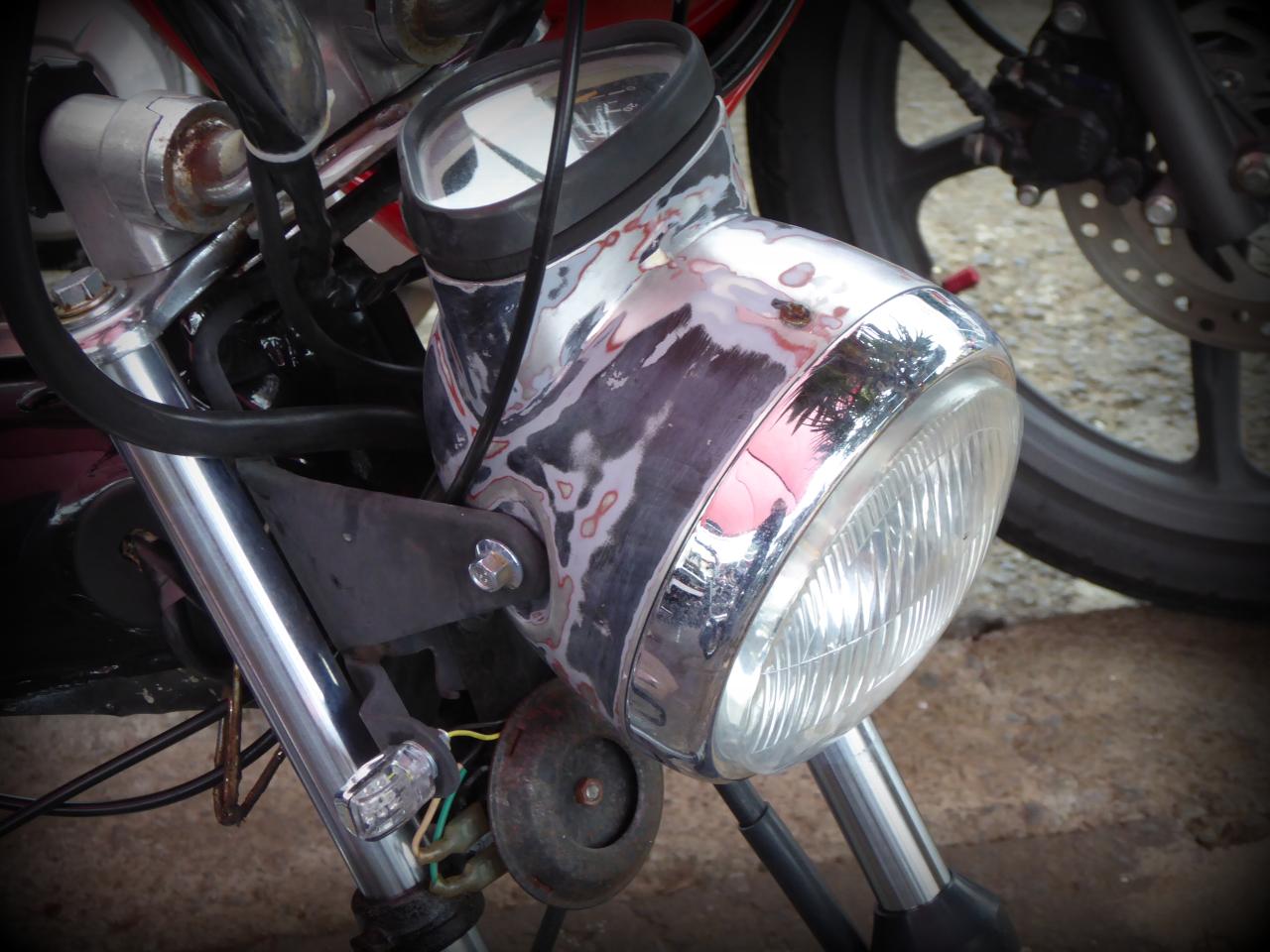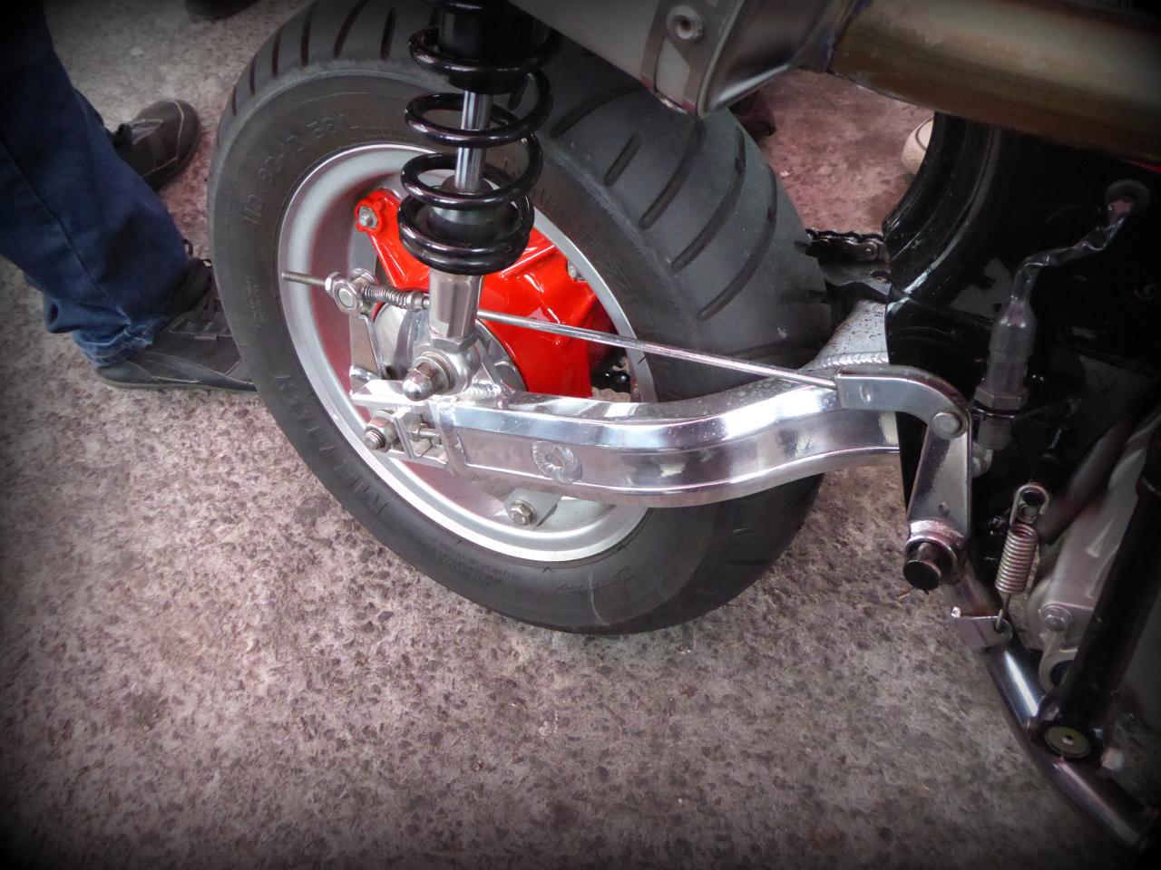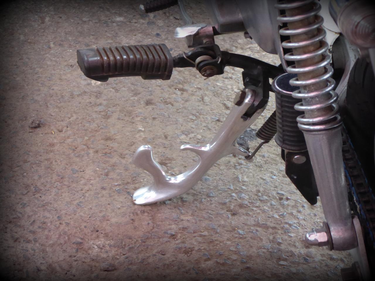 Mais tous vénèrent le dieu Honda, même si celui-ci se métamorphose parfois en avatar chinois Skyteam, fournisseur capricieux mais à peu près fiable. Comme d’habitude, tout le monde m’a montré ses dernières modifs et j’ai montré les miennes. Vins, le Prez, m’avait apporté un chouette cadeau: les étriers complets pour ma Lady Luck qui est en free style à l’avant. Lui, il a remis un tambour à l’avant et me garantit que ça freine mieux, ce que je veux bien croire. En plus, le look est terrible !