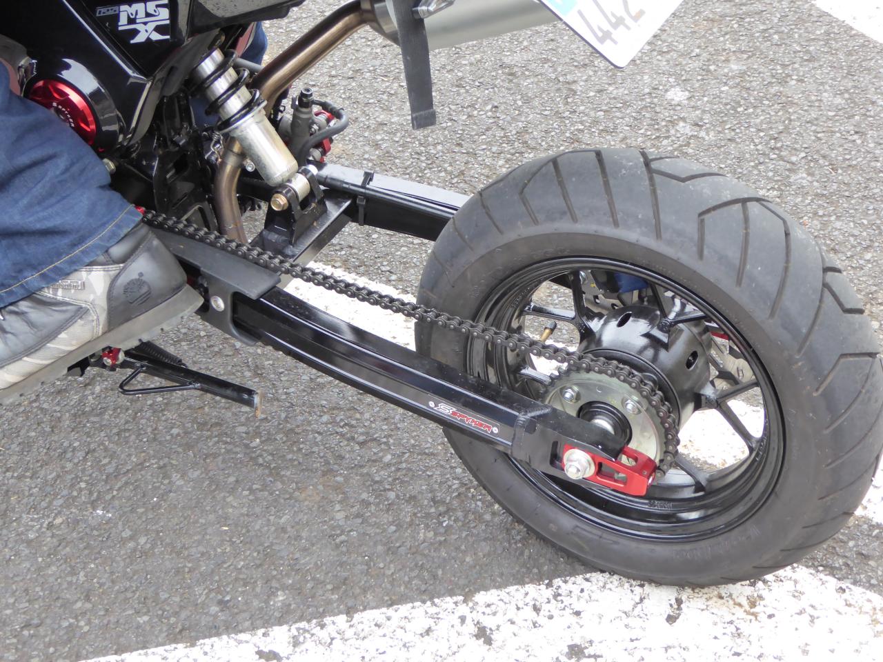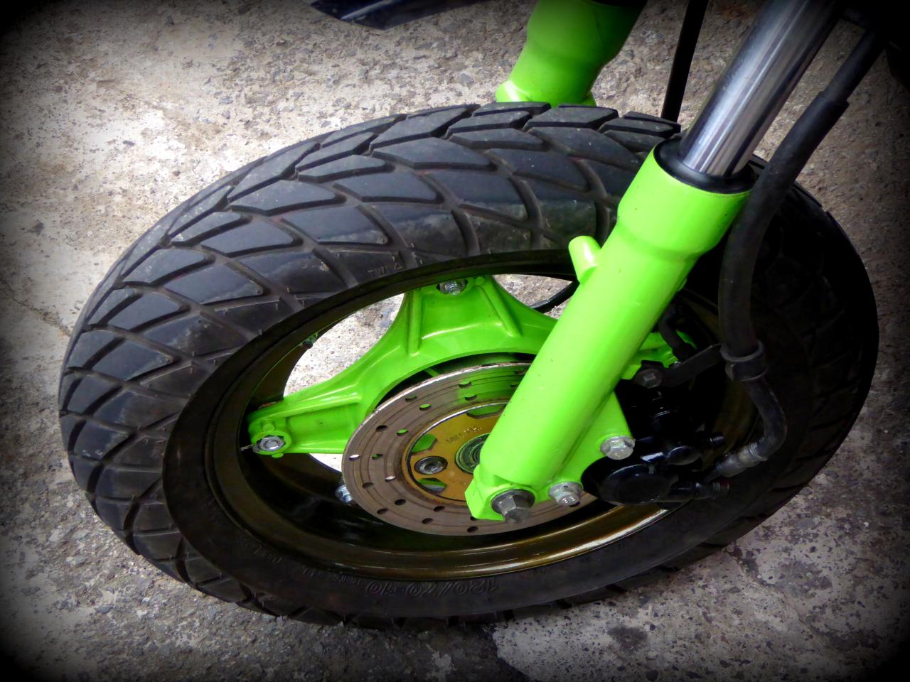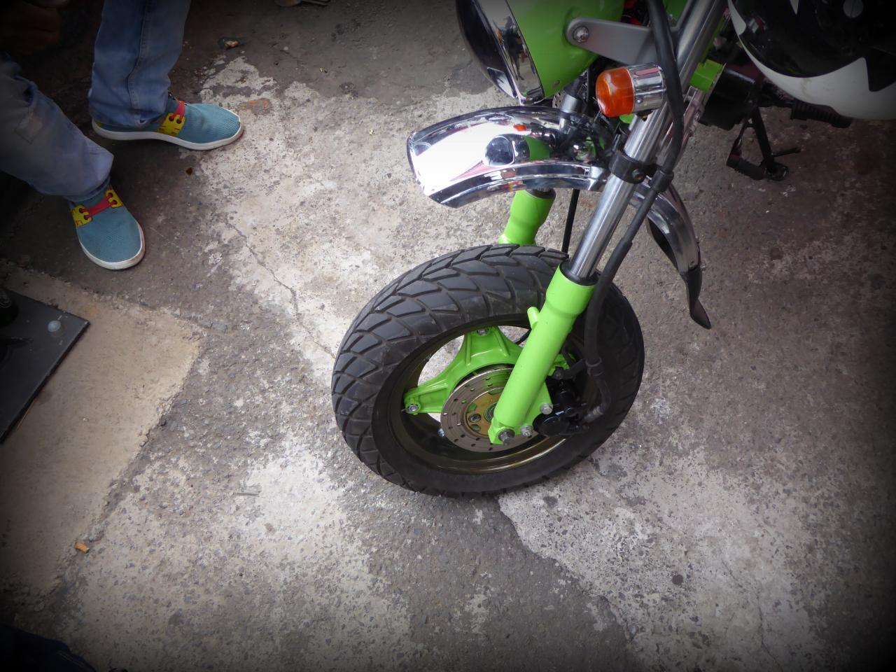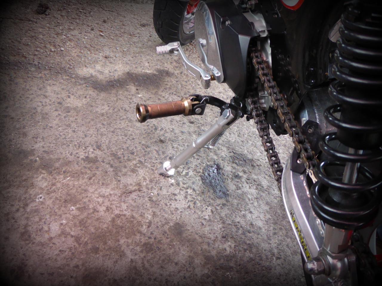 Mais tous vénèrent le dieu Honda, même si celui-ci se métamorphose parfois en avatar chinois Skyteam, fournisseur capricieux mais à peu près fiable. Comme d’habitude, tout le monde m’a montré ses dernières modifs et j’ai montré les miennes. Vins, le Prez, m’avait apporté un chouette cadeau: les étriers complets pour ma Lady Luck qui est en free style à l’avant. Lui, il a remis un tambour à l’avant et me garantit que ça freine mieux, ce que je veux bien croire. En plus, le look est terrible !