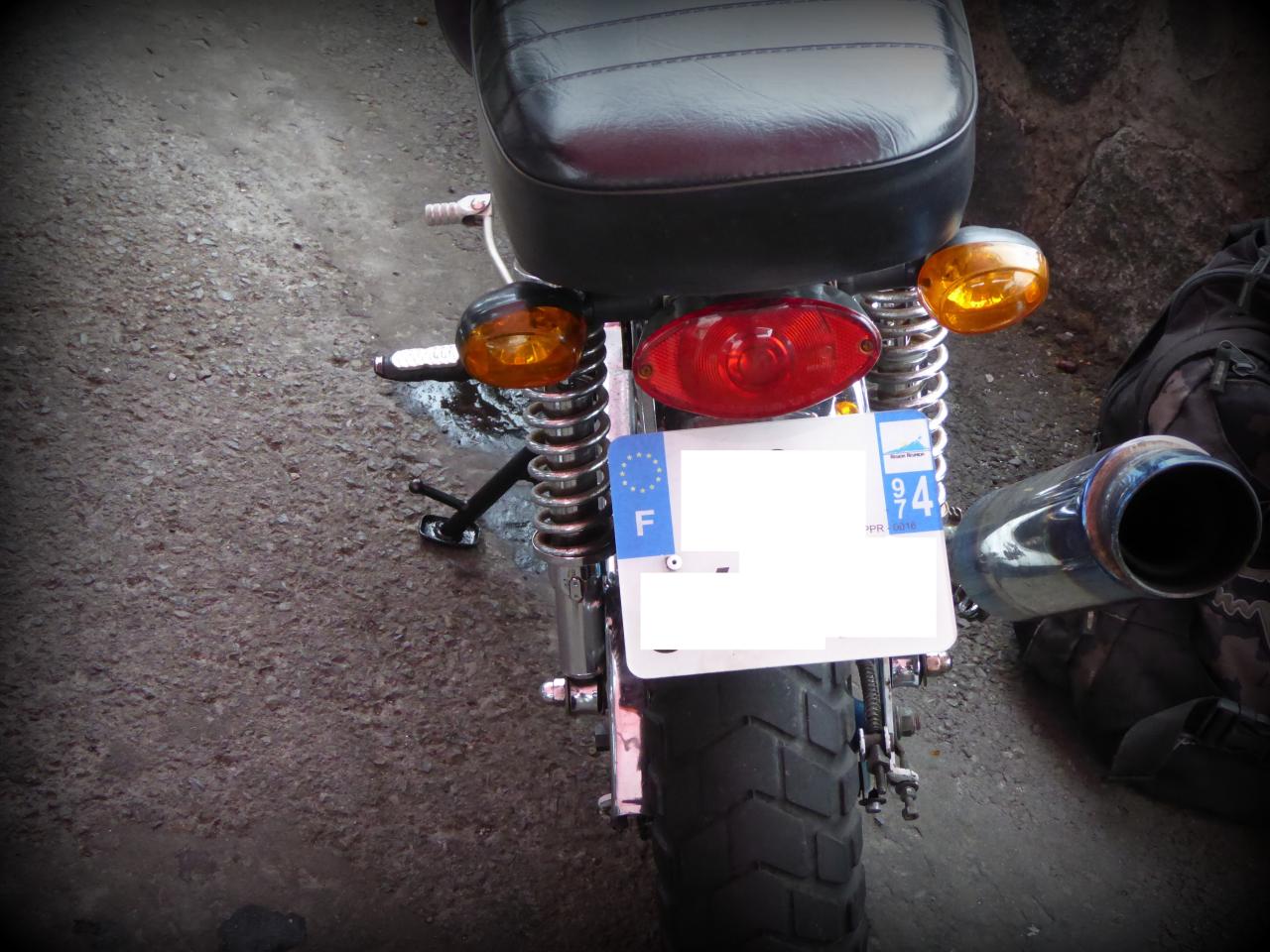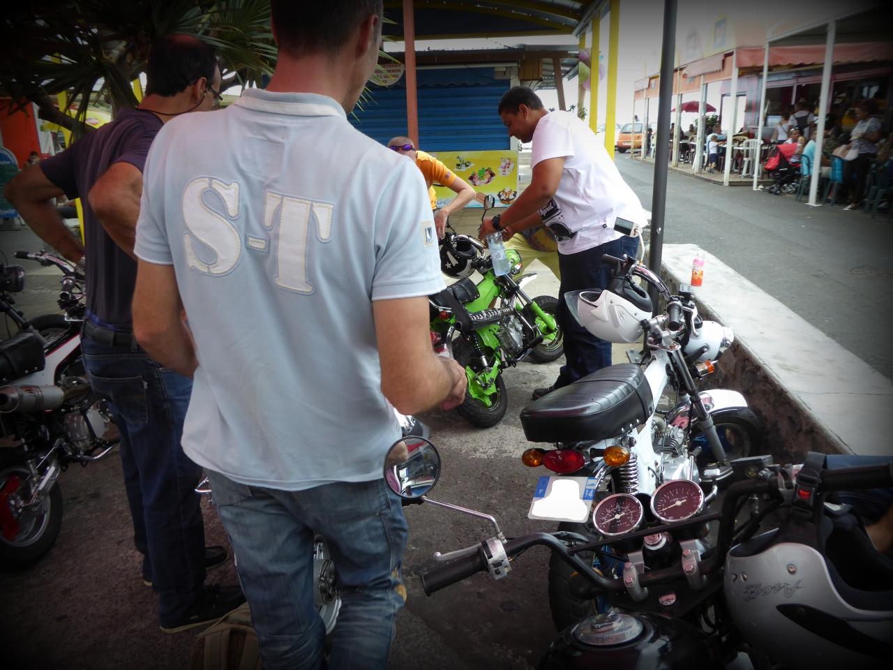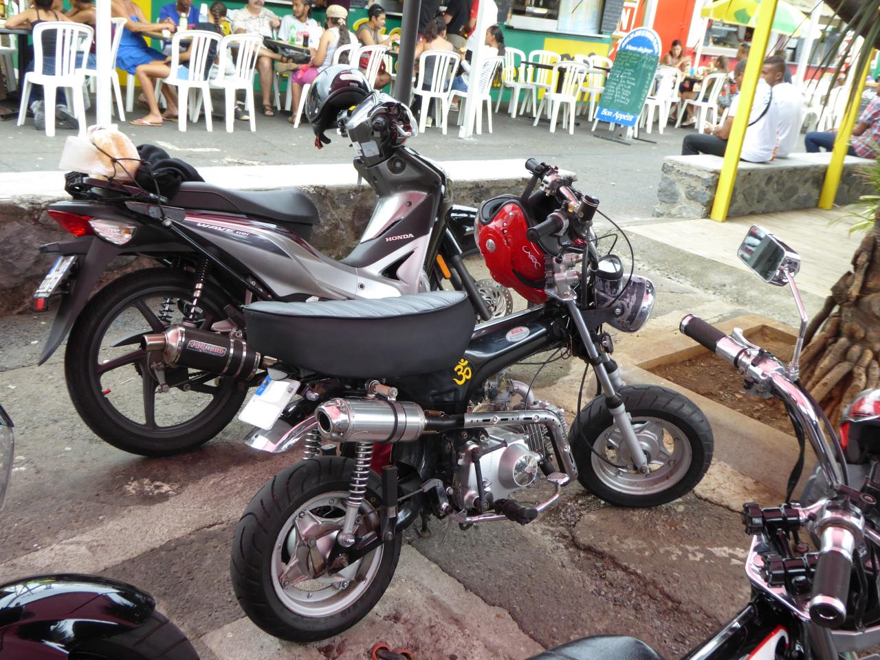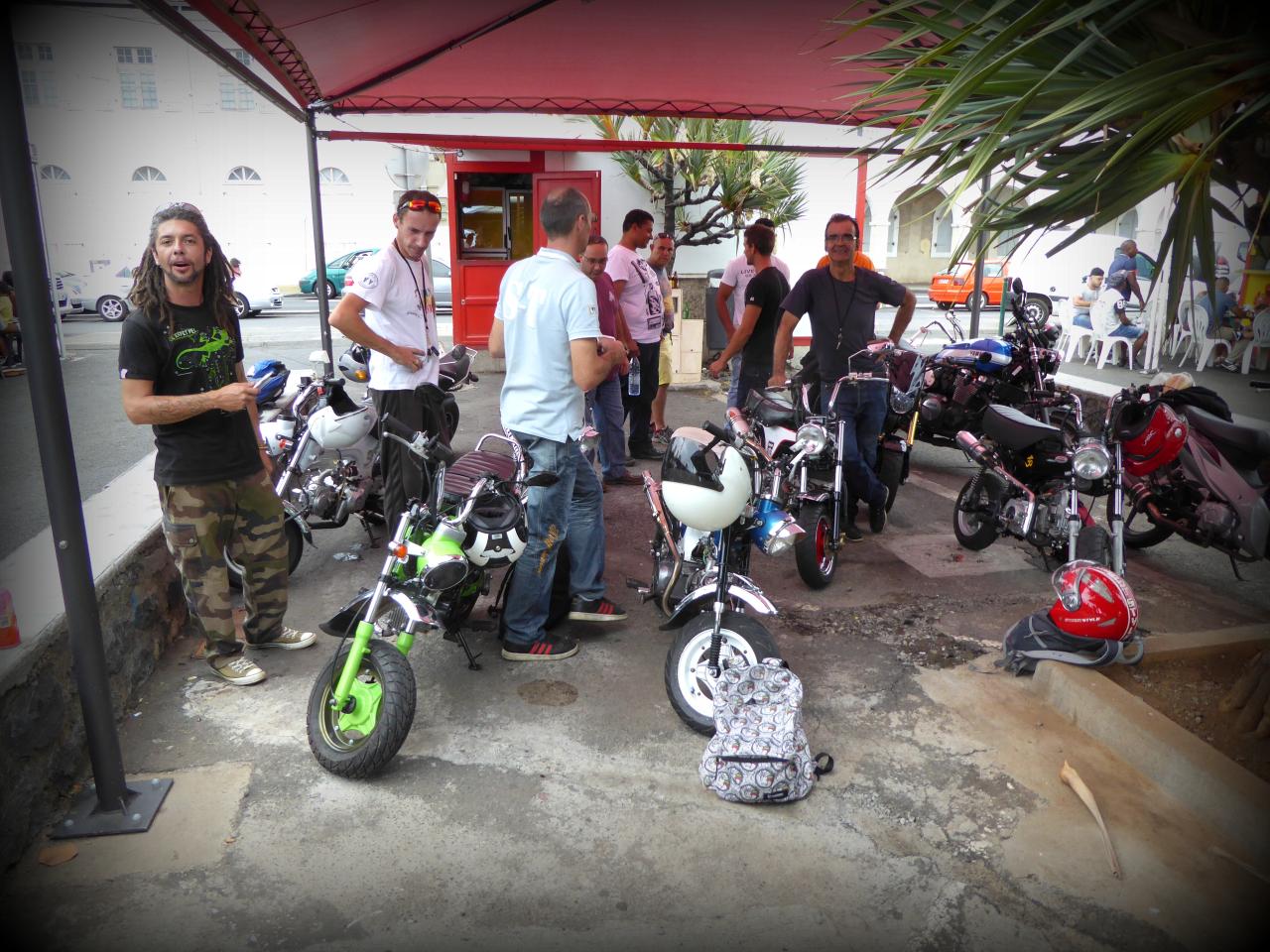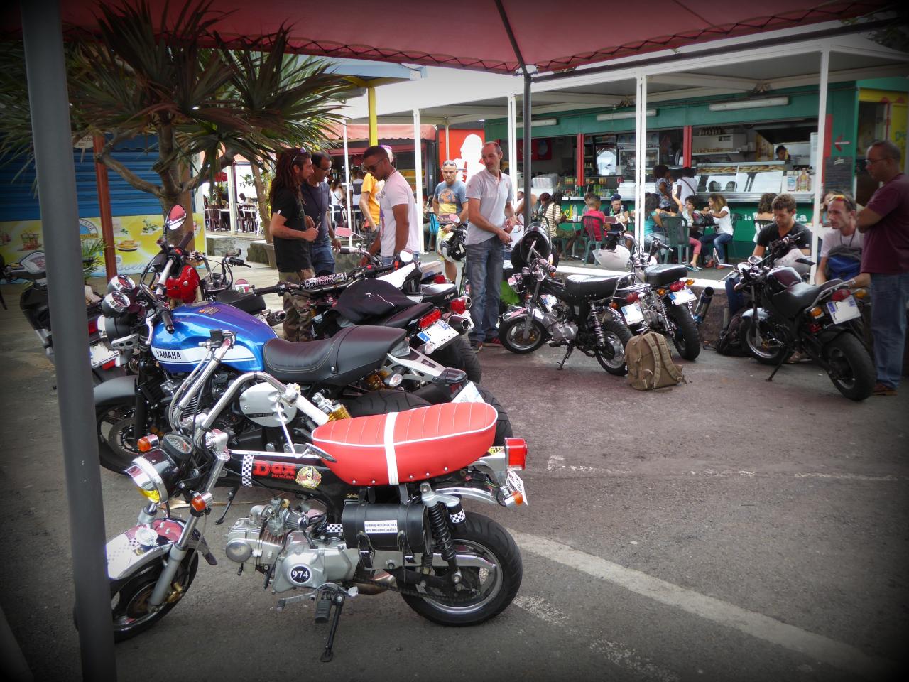 On s’est garés en ligne genre The Wild One devant un bistrot de pêcheurs, le temps de refaire le monde du Dax autour d’un bon verre d’ eau de Cilaos bien fraîche. Les papas en poussette affluèrent et les mamans lancèrent de discrètes œillades affolées mais pas désintéressées. Vins nous expliqua que les statuts du club étaient déposés en préfecture. C’est du sérieux. Je leur racontai alors les derniers ladilafés du milieu custom des « grosses ». ça les a bien fait marrer, et ça les a un peu étonnés en même temps, toutes ces mesquineries. Comme quoi, suffit pas d’avoir une grosse bécane pour être adulte, ni de vendre des motos pour être motard. Mais bon, nous ne sommes pas à plaindre à la Réunion, car Vins m’expliqua qu’à Marseille, certains bikers essayaient de faire tomber les Dax.