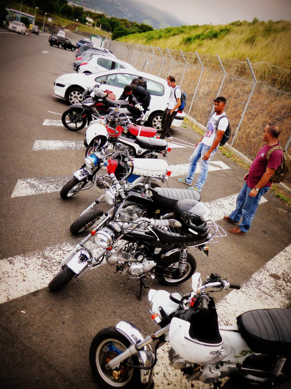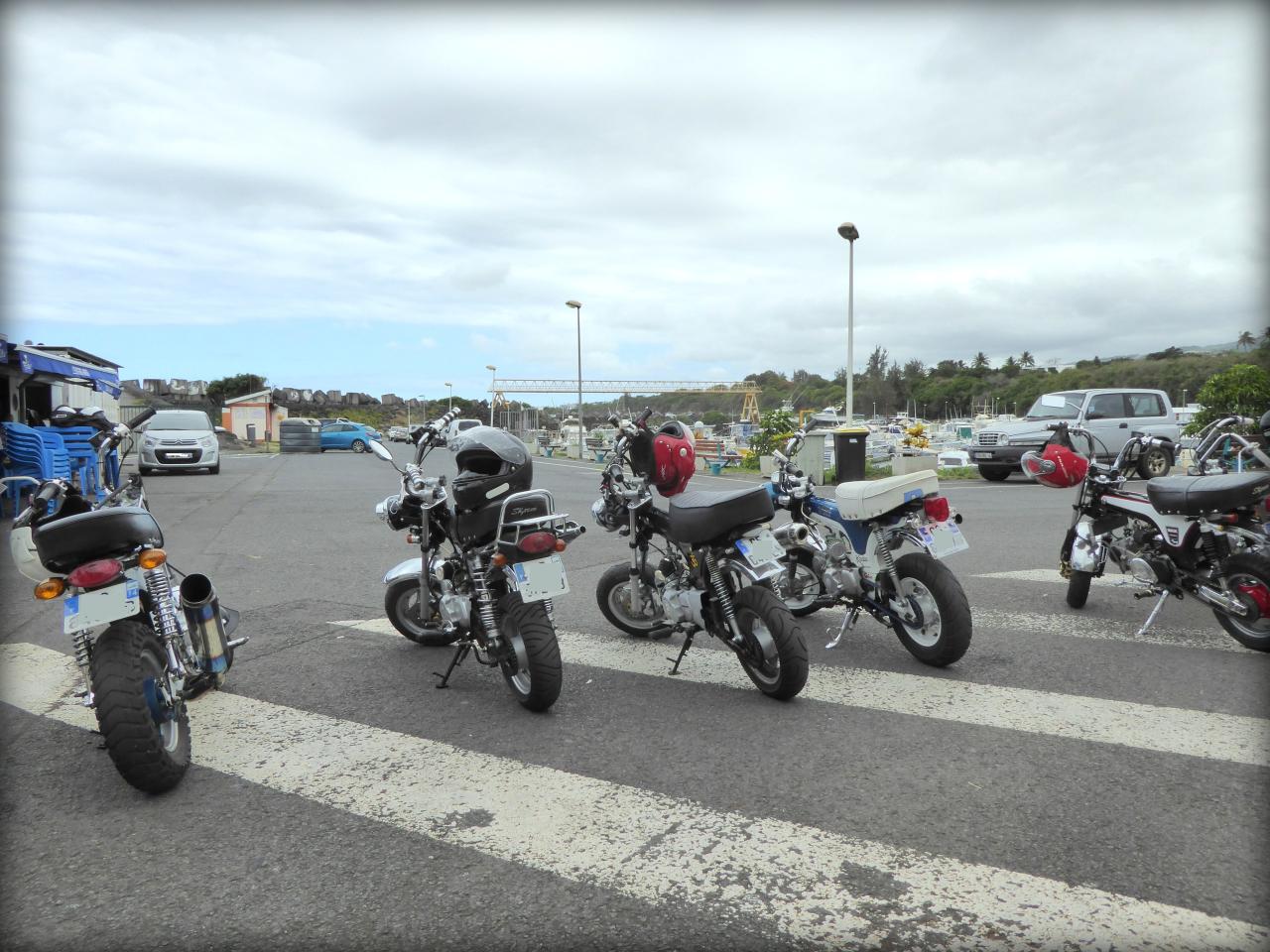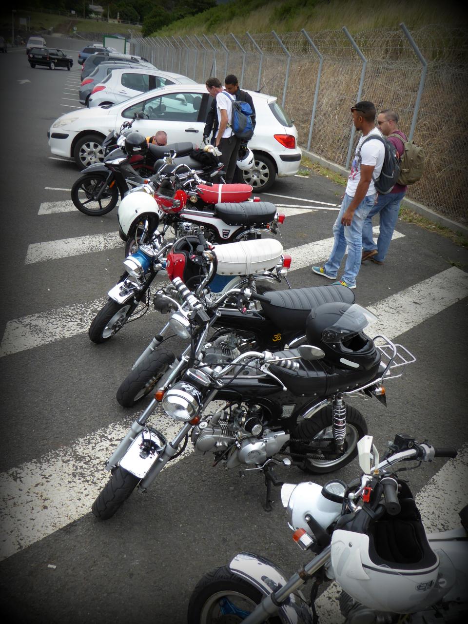 Et au moment de repartir, encore comme d’habitude, y en a un dont le pneu se dégonflait et un autre qui ne démarrait plus. L’avantage du Dax, c’est qu’avec une clé de 10 tu peux tout démonter en 10 mn. C’est un vrai jeu de Mécano. Tout y est passé! Il a essayé tout un tas de bougies, d’alternateurs, de bouts de fils dont l’utilité m’échappe. Tout le monde en profita pour discuter mécanique, les pièces circulant de main en main plus vite que des vignettes Panini dans une cours de récré des années 70 . On procèda même à une extraction du réservoir pour avoir accès au ventre de la bêêêêteuuuuuu. Les coups de kick ne donnaient toujours rien, alors le verdict est tombé: allumage cramé. « Pas grave, je dois en avoir un pour toi à la case ». « OK, quelqu’un d’ici peut remorquer la meule avec un pick up? » « Je peux garder le Dax en attendant les renforts »…c’est ça la solidarité du vrai esprit motard des Dax men (bon il y a aussi une fille dans le club je crois). Ils n’ont pas trop changé depuis l’époque où ils bidouillaient des mobylettes. Ils ont juste des enfants, ils sont plus compétents en mécanique, et plus sereins aussi. Bon, maintenant que le pote avait une solution, il pouvait repartir en passager avec un autre. Il ne fallait pas traîner, car Vins tenait le tube de fourche droit à la main et l’autre copain avait toujours le pneu arrière tout mou. Nous perdîmes ce dernier en court de route. Nous avons appris plus tard que sa chambre s’était extraite de la jante. Moi, je les ai raccompagnés jusqu’au début de la Route en Corniche, et puis je suis revenu sur la capitale avec un pote qui est parti de son côté à Bellepierre. Je me suis senti un peu seul, mais pas tant que ça à la réflexion. C’est bien cool de revoir les gars du club, et de rouler avec certains que je ne voyais qu’en ligne. Il y a toujours des petits soucis mécaniques lors des sorties Dax, mais celle-ci doit détenir le record des pannes. Tout le monde a gardé le sourire, et ça c’est cool. Alors va rendre ta HD en concession, trouve-toi un Dax et viens donc jouer avec nous !