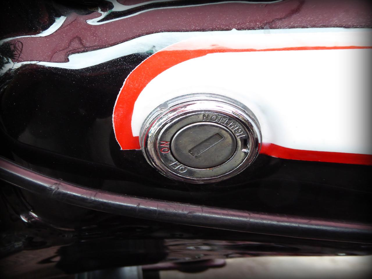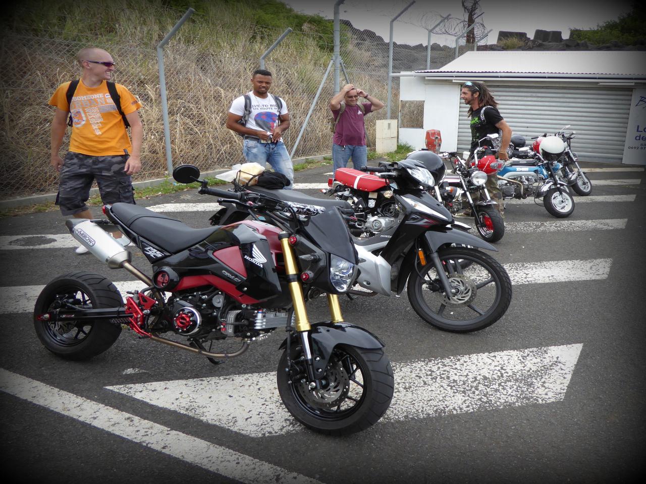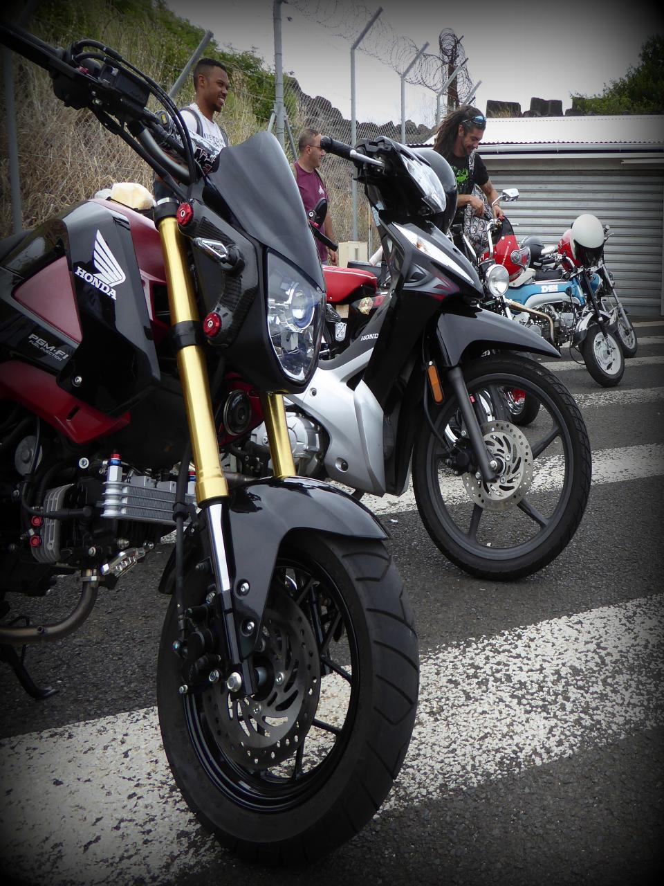 Et au moment de repartir, encore comme d’habitude, y en a un dont le pneu se dégonflait et un autre qui ne démarrait plus. L’avantage du Dax, c’est qu’avec une clé de 10 tu peux tout démonter en 10 mn. C’est un vrai jeu de Mécano. Tout y est passé! Il a essayé tout un tas de bougies, d’alternateurs, de bouts de fils dont l’utilité m’échappe. Tout le monde en profita pour discuter mécanique, les pièces circulant de main en main plus vite que des vignettes Panini dans une cours de récré des années 70 . On procèda même à une extraction du réservoir pour avoir accès au ventre de la bêêêêteuuuuuu. Les coups de kick ne donnaient toujours rien, alors le verdict est tombé: allumage cramé. « Pas grave, je dois en avoir un pour toi à la case ». « OK, quelqu’un d’ici peut remorquer la meule avec un pick up? » « Je peux garder le Dax en attendant les renforts »…c’est ça la solidarité du vrai esprit motard des Dax men (bon il y a aussi une fille dans le club je crois). Ils n’ont pas trop changé depuis l’époque où ils bidouillaient des mobylettes. Ils ont juste des enfants, ils sont plus compétents en mécanique, et plus sereins aussi. Bon, maintenant que le pote avait une solution, il pouvait repartir en passager avec un autre. Il ne fallait pas traîner, car Vins tenait le tube de fourche droit à la main et l’autre copain avait toujours le pneu arrière tout mou. Nous perdîmes ce dernier en court de route. Nous avons appris plus tard que sa chambre s’était extraite de la jante. Moi, je les ai raccompagnés jusqu’au début de la Route en Corniche, et puis je suis revenu sur la capitale avec un pote qui est parti de son côté à Bellepierre. Je me suis senti un peu seul, mais pas tant que ça à la réflexion. C’est bien cool de revoir les gars du club, et de rouler avec certains que je ne voyais qu’en ligne. Il y a toujours des petits soucis mécaniques lors des sorties Dax, mais celle-ci doit détenir le record des pannes. Tout le monde a gardé le sourire, et ça c’est cool. Alors va rendre ta HD en concession, trouve-toi un Dax et viens donc jouer avec nous !
