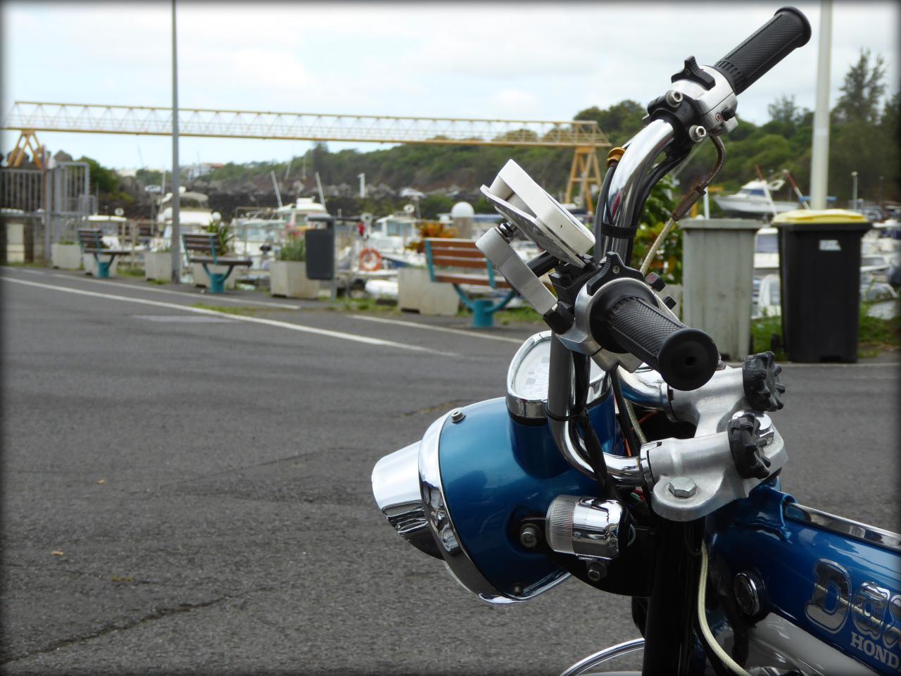 Juste le temps de faire tomber un ou deux Dax à l’arrêt, comme d’habitude, et nous sommes partis en direction du Port de Sainte Marie pour un mini ride ensemble et un bon café. Comme d’habitude, au moment de sortir de Saint Denis, un pote a crevé. Joli morceau de verre pointu dans le pneu. Mais la garage Yamaha est à côté. Un coup de bombe et quelques klaxons de sympathie des caisseux plus tard, et nous revoilà en selle. Quel bonheur ! J’ai trop kiffé le confort de mon guidon allongé et de ma selle de pacha.