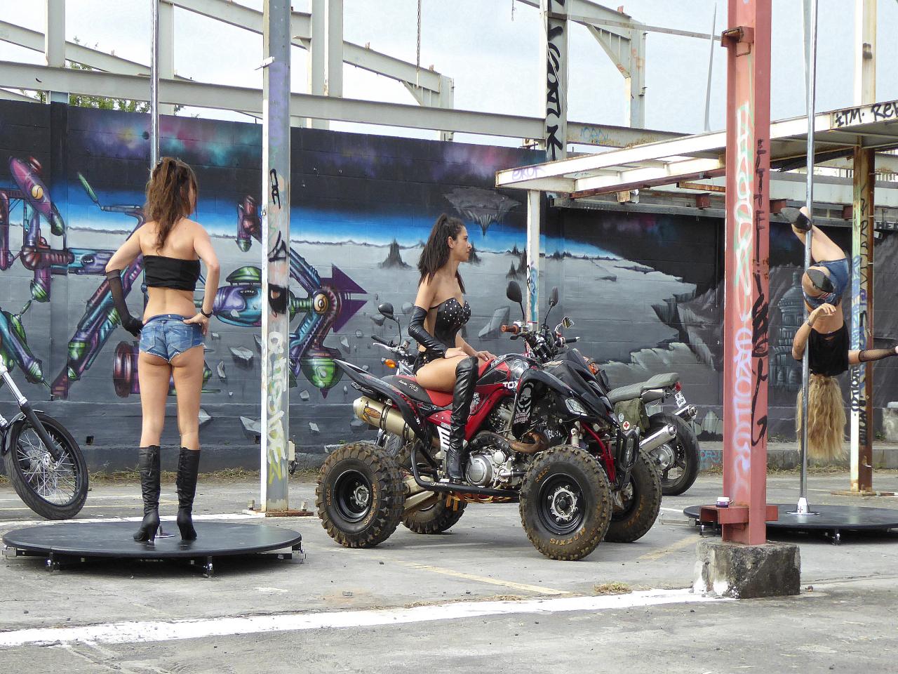 L’ambiance était vraiment chouette. C’était fendard de faire découvrir aux potos un univers qu’ils voyaient peut-être de manière un peu caricaturale à travers les clips de lap dance pour bikers. Bien entendu, il s’agissait de jouer avec les codes un peu « cliché » du rock, des machines et des bombasses. Mais nous n’avons participé qu’au teaser du clip. L’essentiel de la vidéo montrera une choré soigneusement mise au point et inlassablement répétée par Sandrine et sa team rocket gavée de Bulma toutes plus jolies et cools les unes que les autres !!! Leurs compagnons étaient là, parfois, et c’était bien cool aussi. J’ai ainsi découvert l’existence d’un club de quad dans les hauts. D’ailleurs, une des filles est une pro du quad, deux ont le permis moto et une autre a revendu sa HD ! Du coup, non seulement on pouvait regarder jusqu’à plus soif le mariage de la nature et de la culture autour d’une barre X-stage, mais encore on avait plein de trucs à se dire !