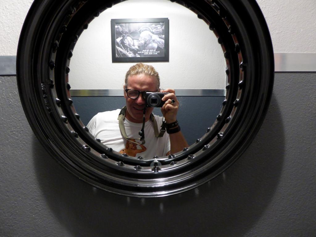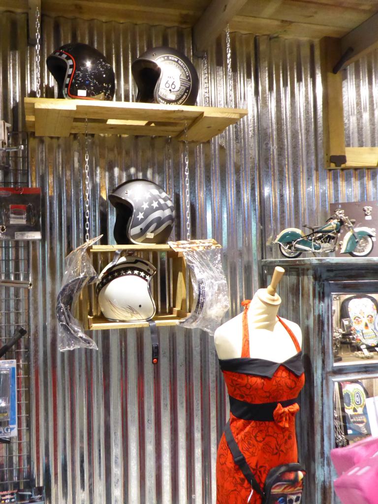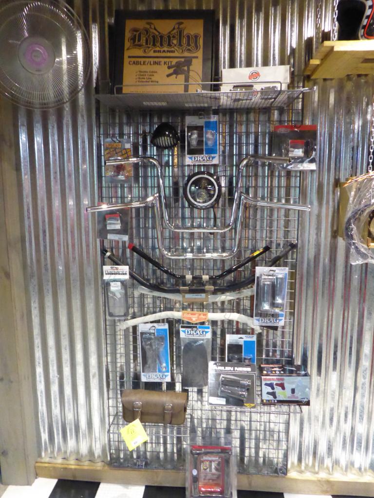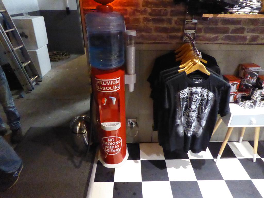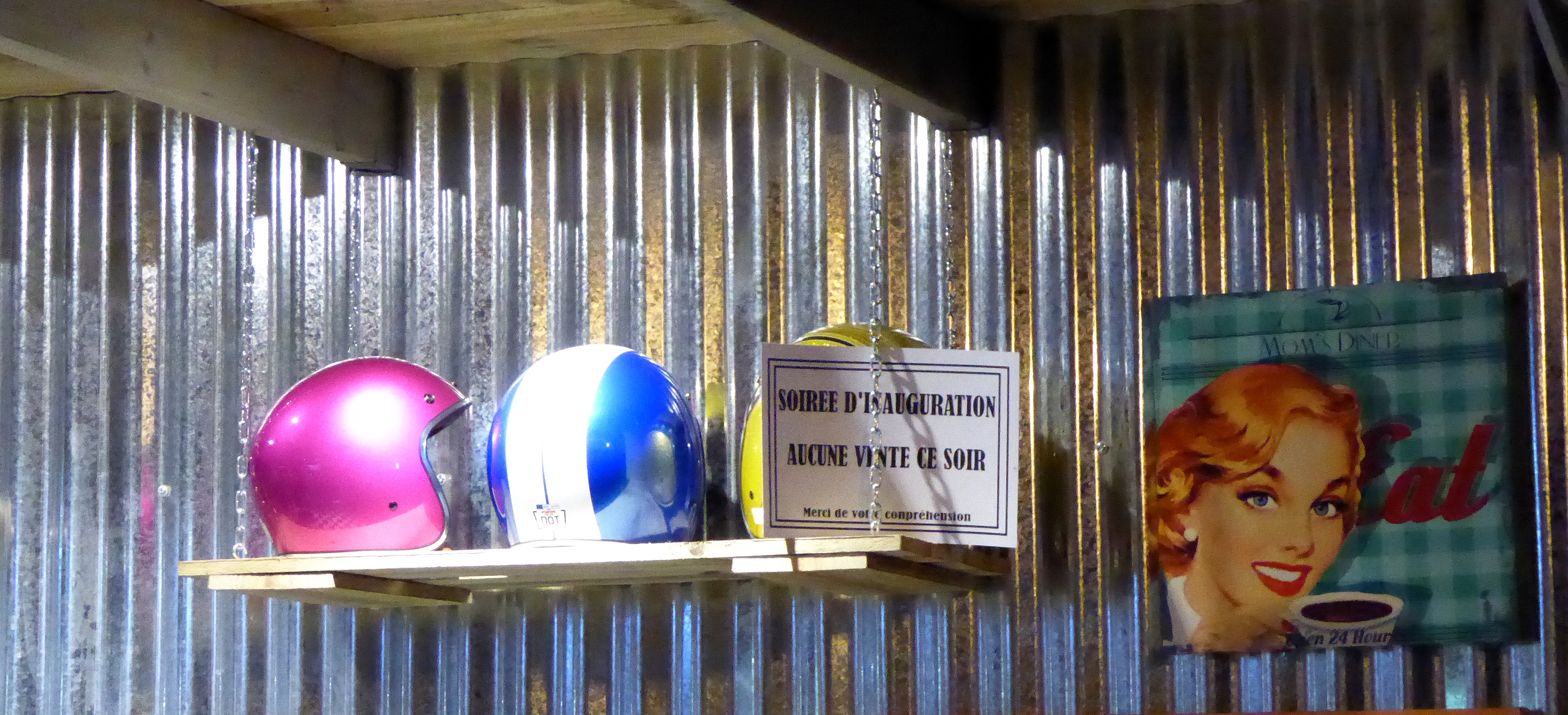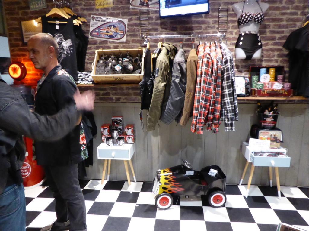 Au bout de 15 potes, de 15 conversations avec photos sans flash, et de 15 mètres parcourus sur la terre battue nocturne, j’ai enfin atteint Yves et son antre nouvelle. Il nous a reçus avec son tact et sa simplicité habituelle. C’était vraiment un chouette moment, partagé avec sa chérie, dont on pouvait reconnaître la touche dans pas mal d’éléments de la déco. En gros, à droite, on a une adorable boutique où on a envie de tout acheter (et on peut car c’est un très bon rapport qualité/prix comparé aux extorsions souvent pratiquées dans le milieu). On se retrouve instantanément dans Happy Days ! Ne manque plus que Fonzie et sa Triumph Trophy TR5 de 49 (et oui, désolé les gars, hein, mais ce n’était pas une HD. Bon, il est vrai que l’acteur, Henry Winkler, n’était même pas motard). Les produits tourneront vite. Si vous achetez, vous ne croiserez que peu de gens avec, car les articles suivant ne seront pas forcément les mêmes. C’est un choix judicieux pour éviter ce qu’on voit trop souvent : les mêmes gars sur les mêmes motos avec les mêmes logos orange un peu partout. De la vraie kustom Kultur quoi.
