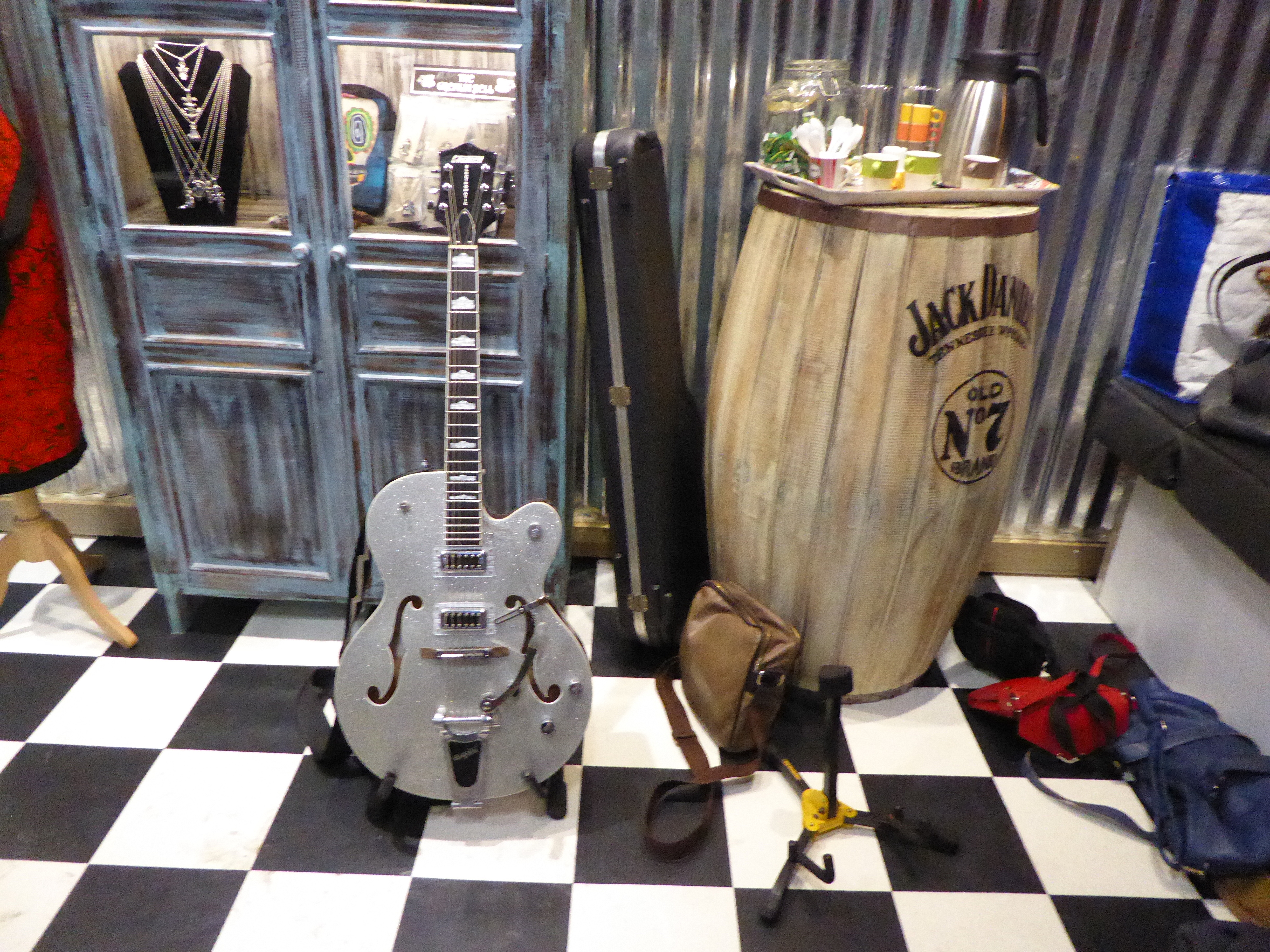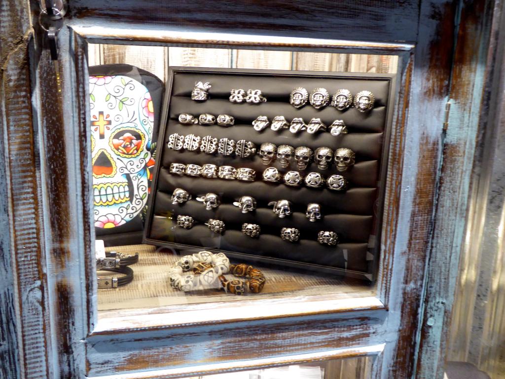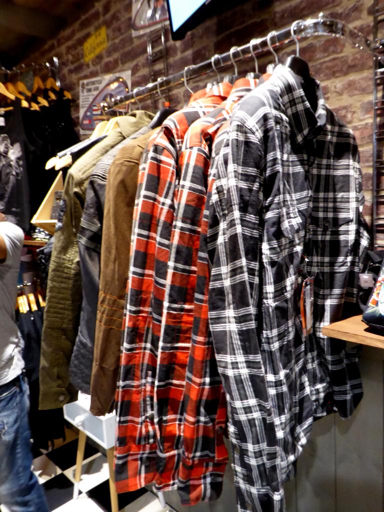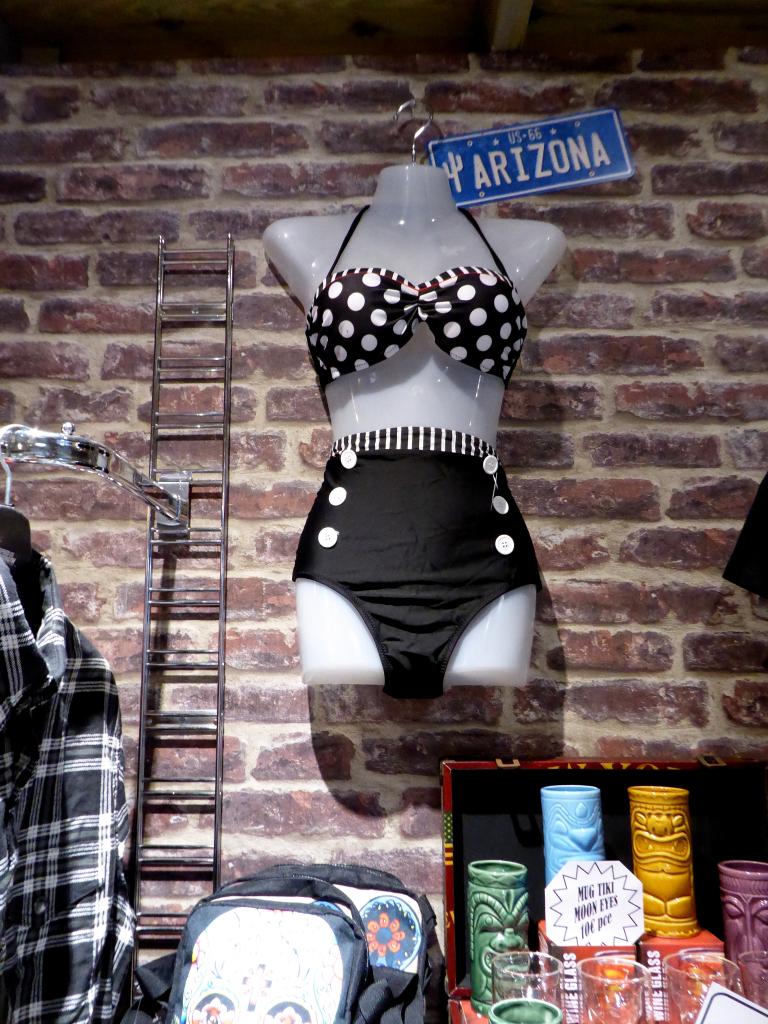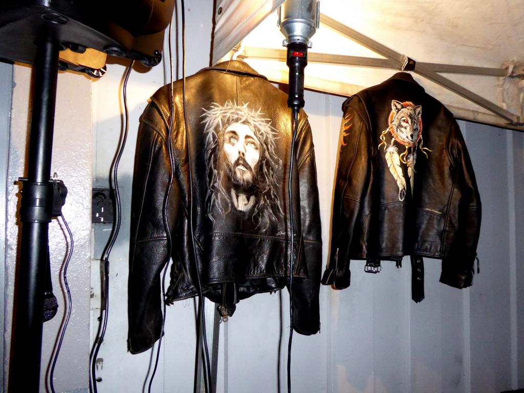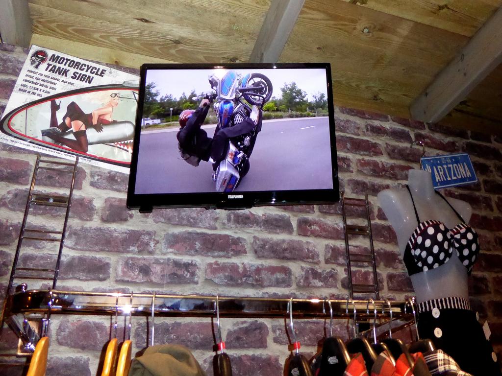 Au bout de 15 potes, de 15 conversations avec photos sans flash, et de 15 mètres parcourus sur la terre battue nocturne, j’ai enfin atteint Yves et son antre nouvelle. Il nous a reçus avec son tact et sa simplicité habituelle. C’était vraiment un chouette moment, partagé avec sa chérie, dont on pouvait reconnaître la touche dans pas mal d’éléments de la déco. En gros, à droite, on a une adorable boutique où on a envie de tout acheter (et on peut car c’est un très bon rapport qualité/prix comparé aux extorsions souvent pratiquées dans le milieu). On se retrouve instantanément dans Happy Days ! Ne manque plus que Fonzie et sa Triumph Trophy TR5 de 49 (et oui, désolé les gars, hein, mais ce n’était pas une HD. Bon, il est vrai que l’acteur, Henry Winkler, n’était même pas motard). Les produits tourneront vite. Si vous achetez, vous ne croiserez que peu de gens avec, car les articles suivant ne seront pas forcément les mêmes. C’est un choix judicieux pour éviter ce qu’on voit trop souvent : les mêmes gars sur les mêmes motos avec les mêmes logos orange un peu partout. De la vraie kustom Kultur quoi.