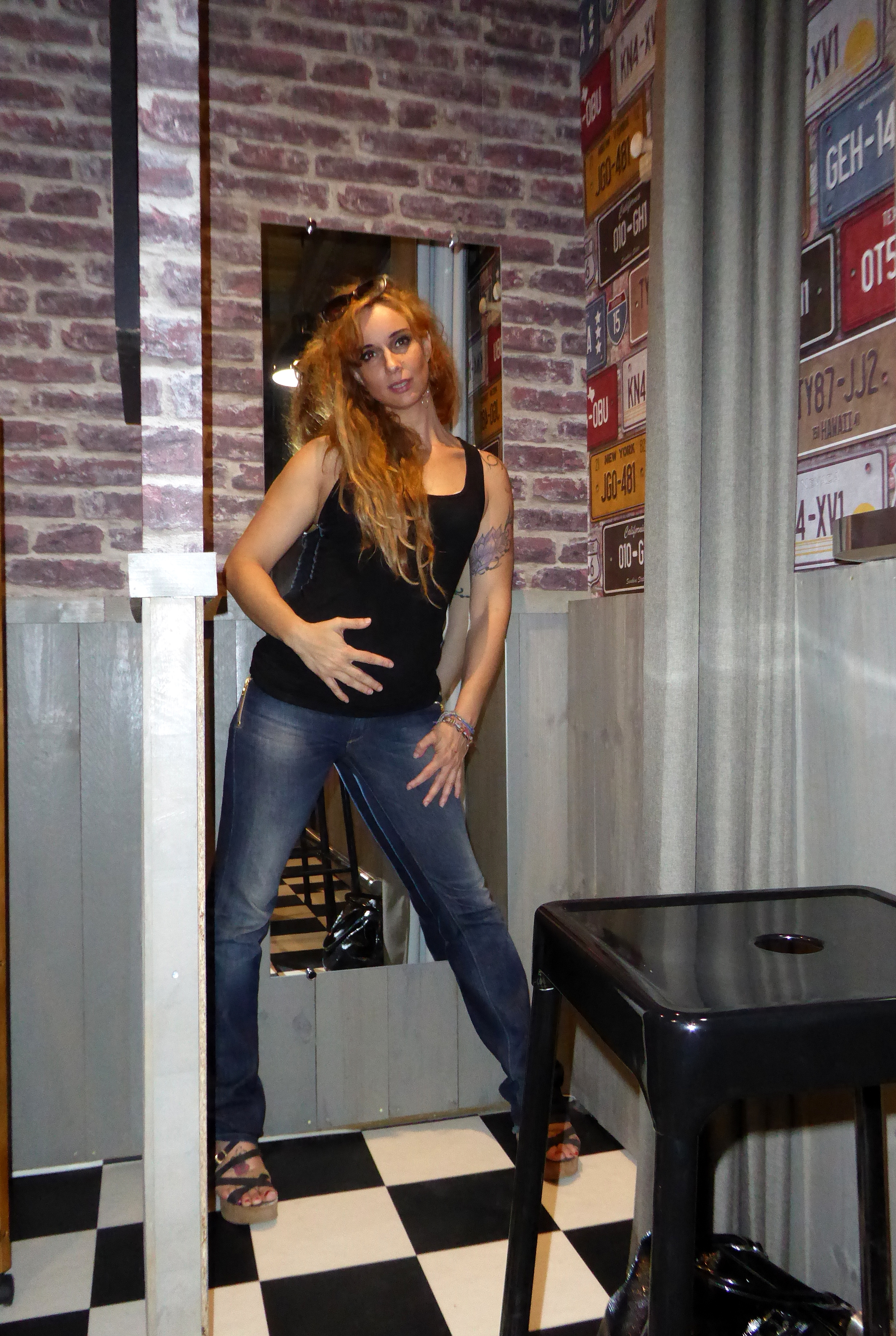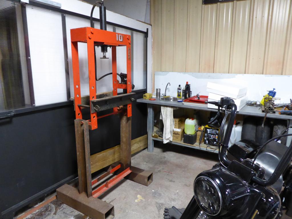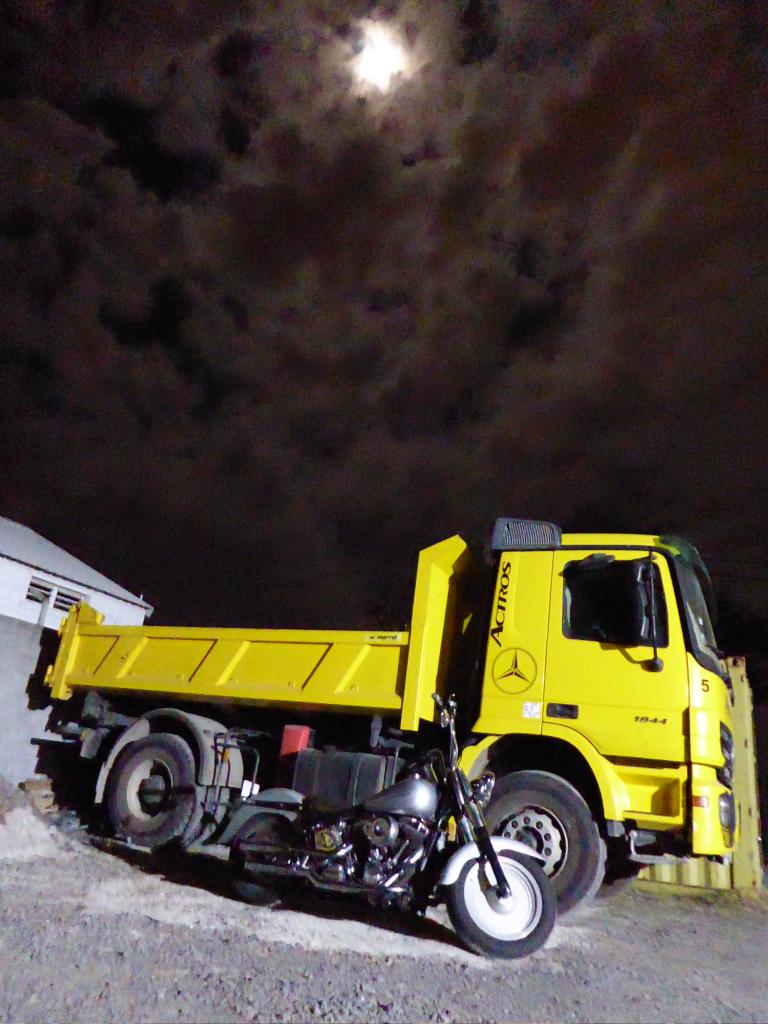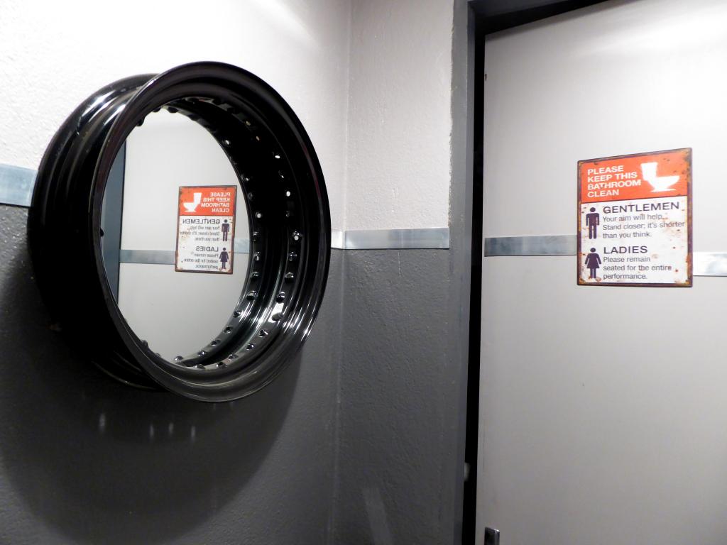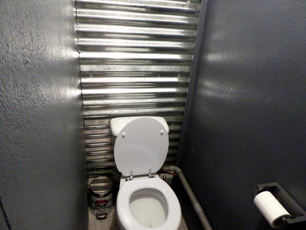 A gauche, c’est la partie atelier. Je l’avais prédit à ma chérie (Aude-Eammanuelle, hein, pas une de mes motos. Je sais, je leur parle parfois, pas vous? Bon, chuttt, ça retse entre nous). « Tu verras : dans son camion, tu peux manger part terre, alors l’atelier risque d’être hyper clean. » Je sais qu’on mange rarement par-terre. Mais tout de même, j’aime bien l’image. Et bien pari gagné ! Même les chiottes sont stylés et nickel. Et c’est Yves qui a tout fait de ses mains. Sauf les trucs à souder. Parce que le Yves, il a débusqué et recruté une soudeuse. Pas une machine ! Non, une vraie fille hyper canon et sympa et qui fait des soudures dignes d’un artiste. Mince, elle a soudé la barre du bar, et j’ai oublié de prendre une photo. Bon, ce sera l’occasion d’y retourner pour faire un nouveau post.