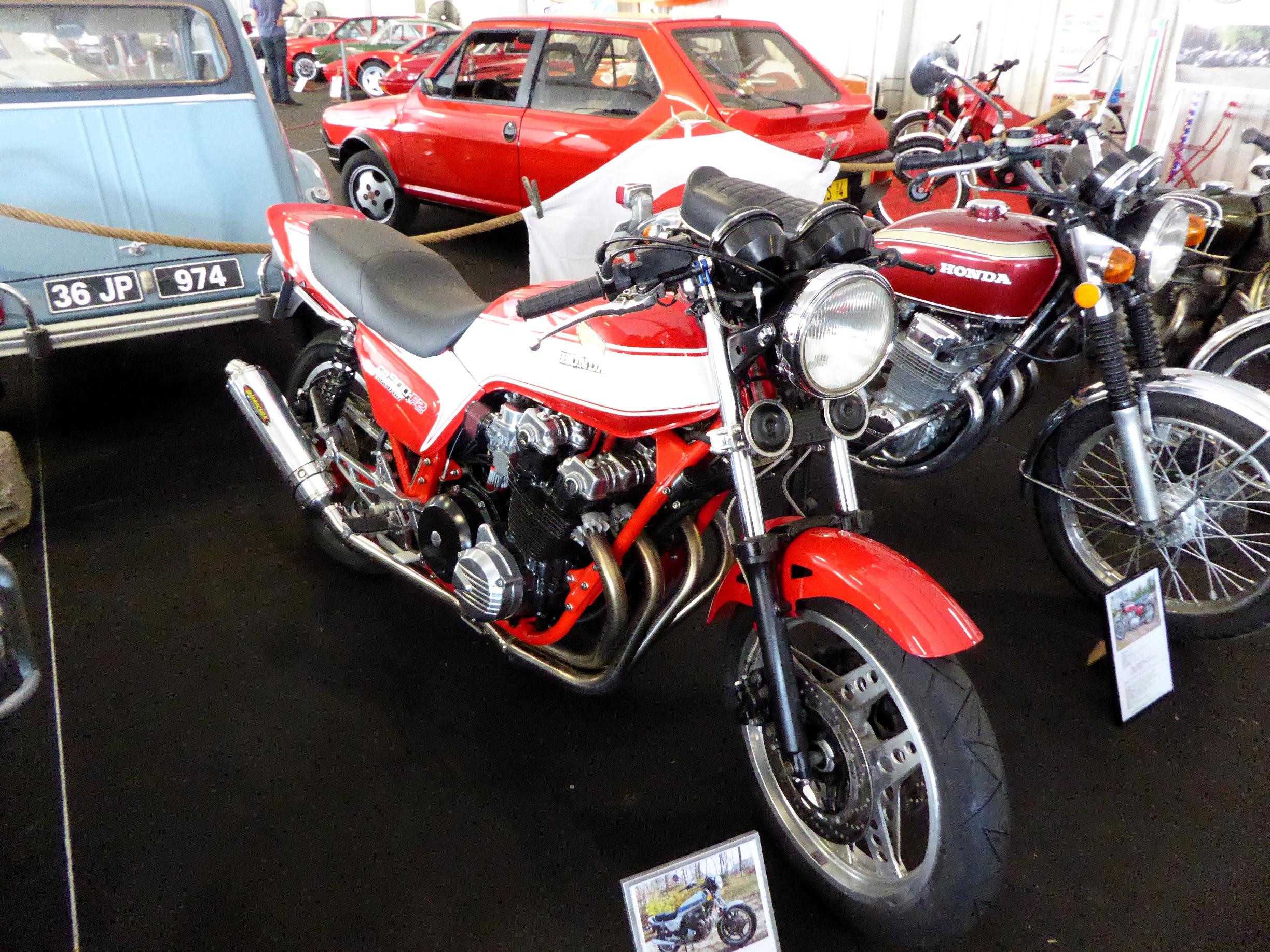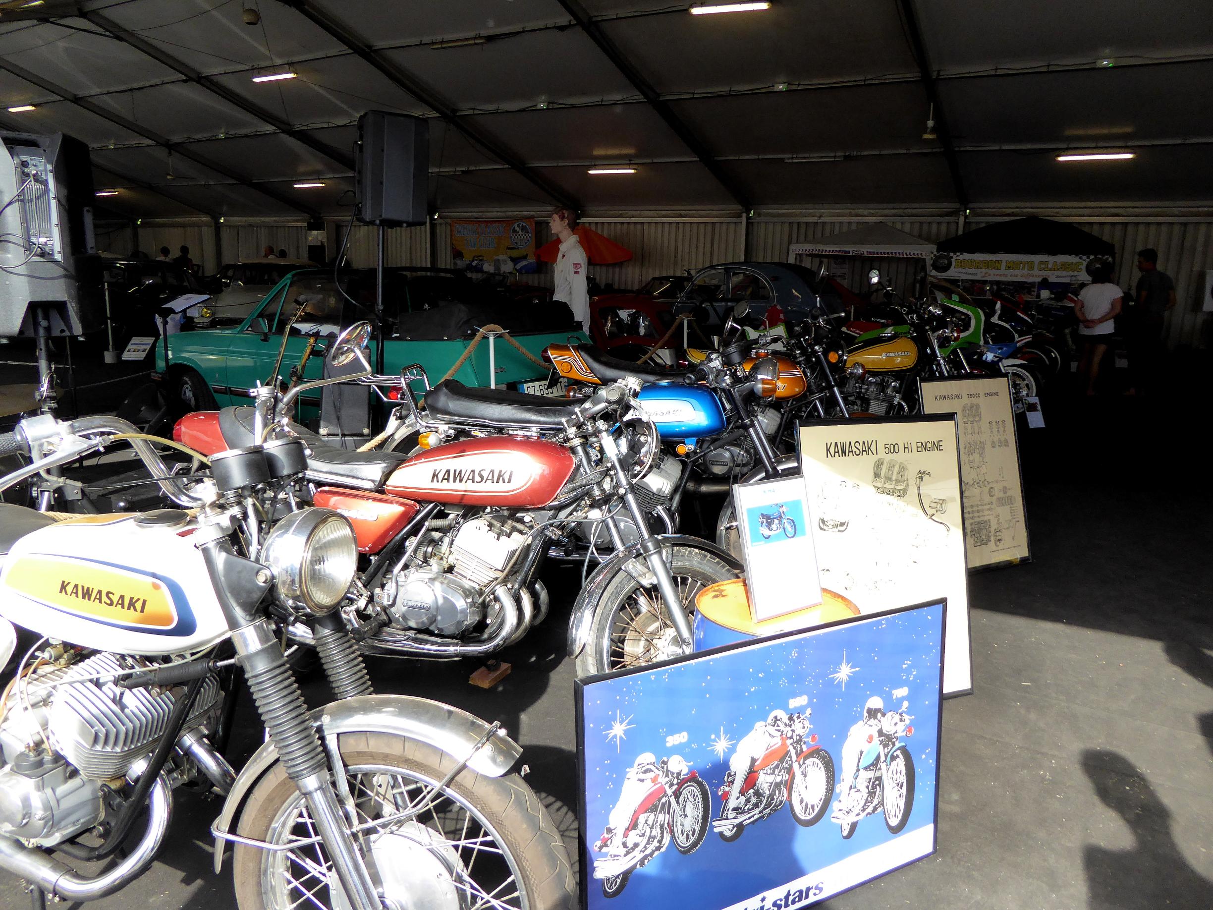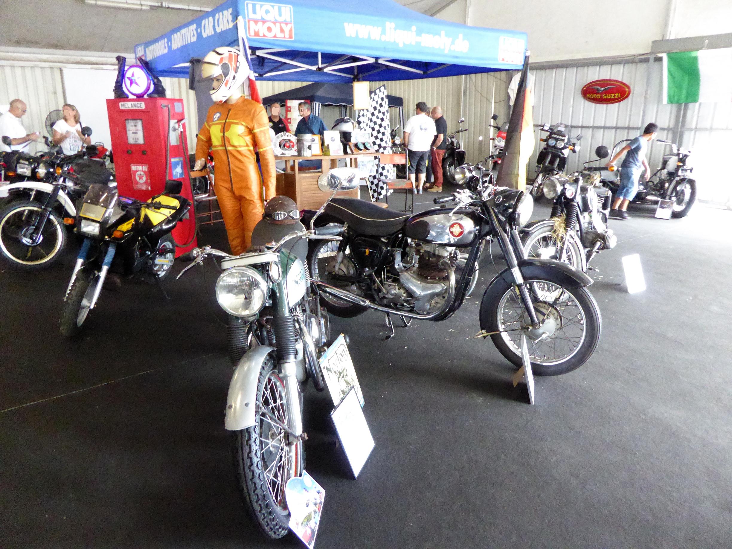 -si, après avoir pris ton bain de stock, bien déprimé, tu viens te réfugier dans l’autre hangar, celui des vieilles bécanes des copains du Bourbon Moto Classic et des vieilles caisses qui leur servent de vénérables voisines. A chaque fois, je crois avoir déjà fait le tour à l’avance. A chaque fois, Max me ravit en me faisant découvrir, avec la générosité et la passion bienveillante qui l’animent, de nouvelles anciennes. Même au sein de leur club, certains membres chevronnés mais cachottiers et modestes, leur sortent soudain de leur garage, l’air de rien, presque gênés, des Katanas mythiques et autres Bianchi rescapées d’une grange transalpine. Quel plaisir, grâce à ce beau et grand stand, de se replonger dans la délicieuse nostalgie, toujours roulante et valeureuse, d’une époque où même les voitures étaient belles. Où l’on pouvait encore faire de la mécanique avec un vieux guide technique étalé dans les flaques d’huile. L’époque où ma maman fendait la route en torturant le petit moteur nerveux de sa 500 décapotable. Ce n’était pas du néo-rétro. Non. C’était juste la route.