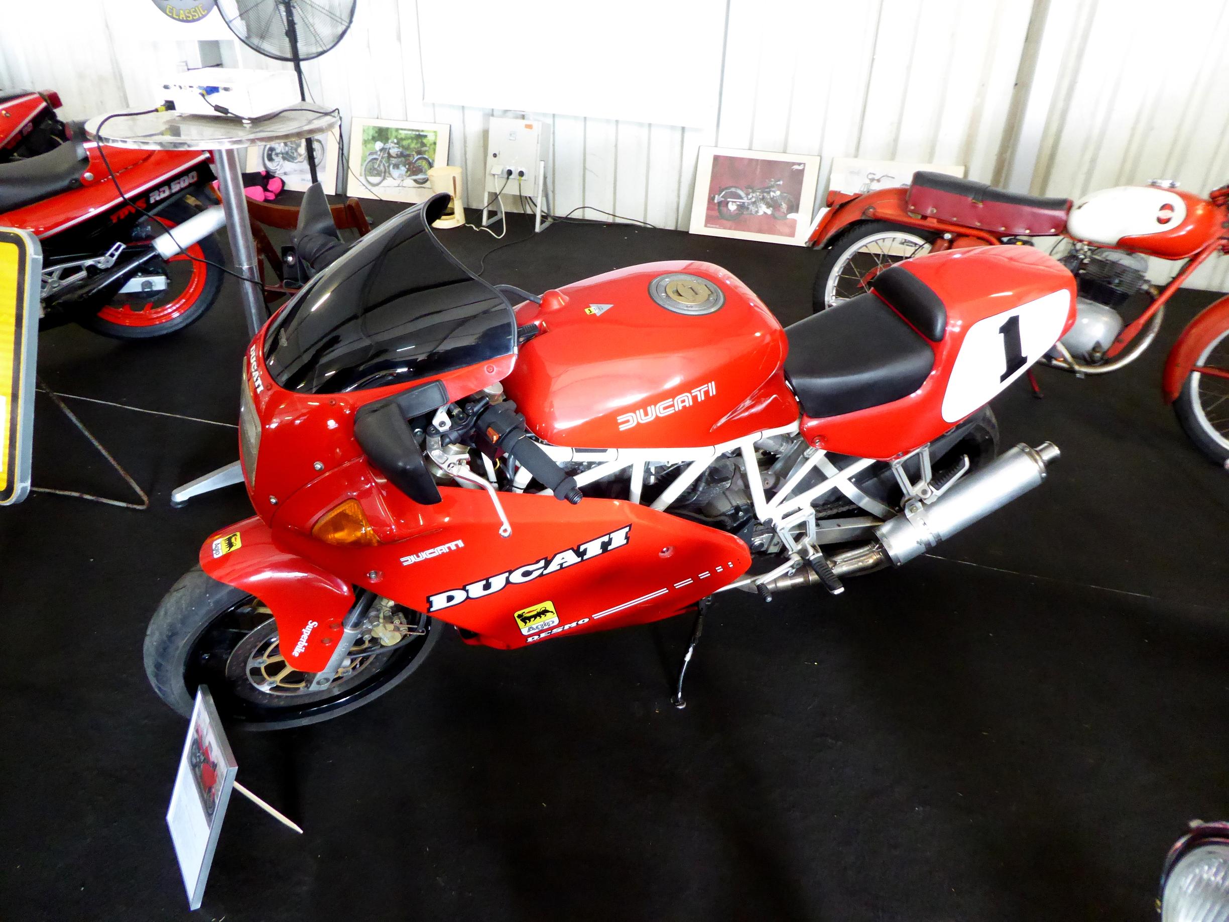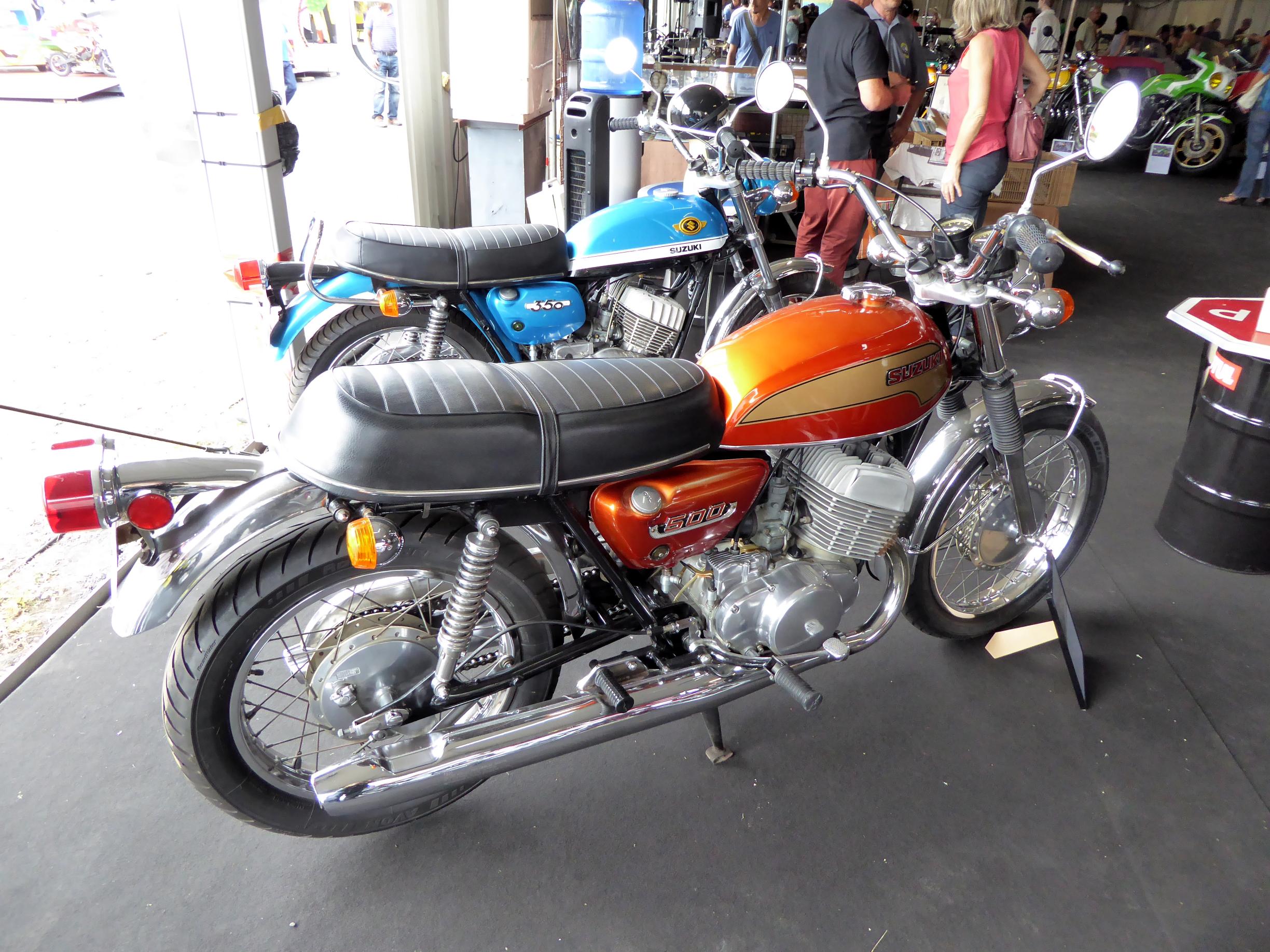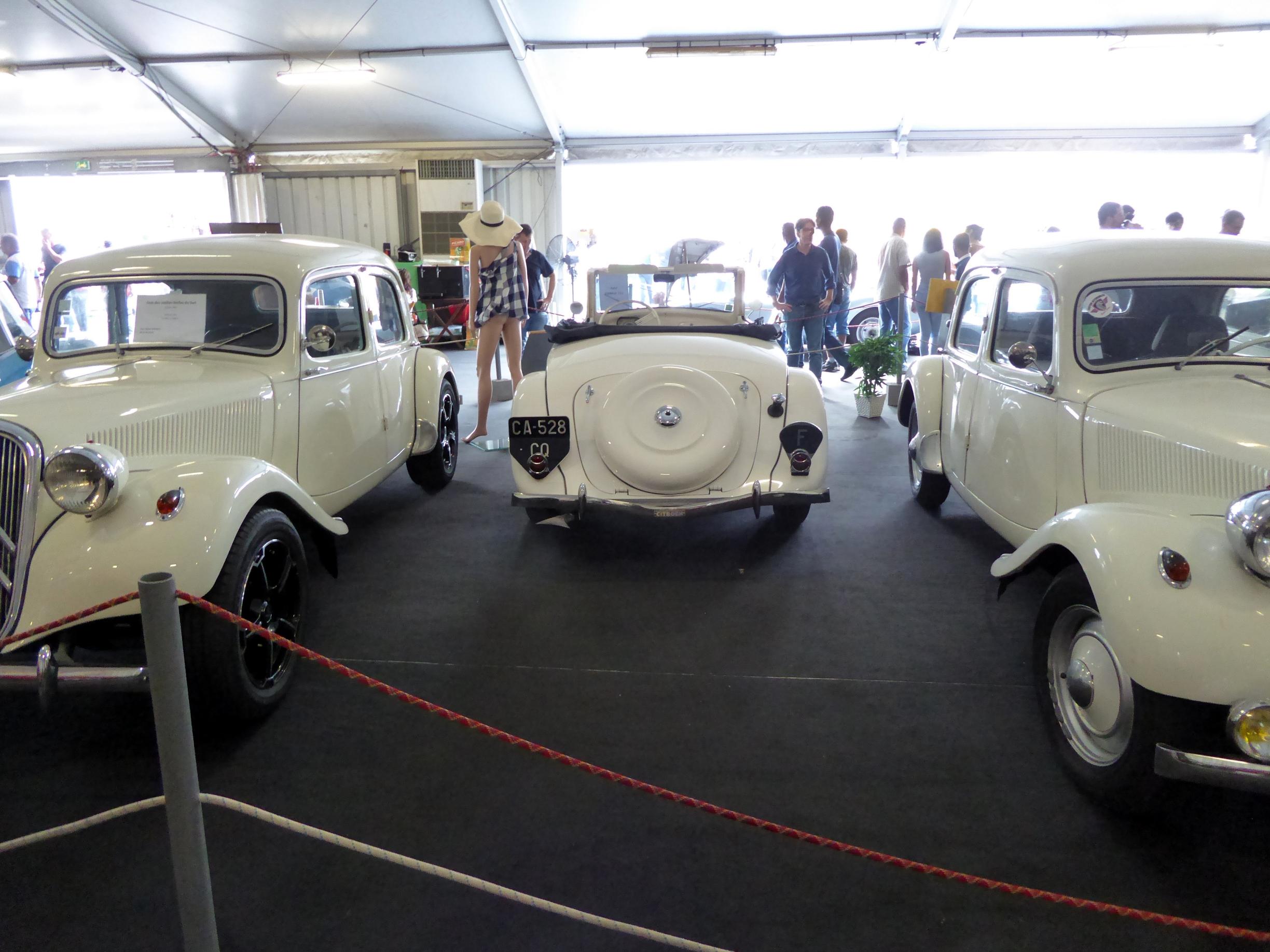 -si, après avoir pris ton bain de stock, bien déprimé, tu viens te réfugier dans l’autre hangar, celui des vieilles bécanes des copains du Bourbon Moto Classic et des vieilles caisses qui leur servent de vénérables voisines. A chaque fois, je crois avoir déjà fait le tour à l’avance. A chaque fois, Max me ravit en me faisant découvrir, avec la générosité et la passion bienveillante qui l’animent, de nouvelles anciennes. Même au sein de leur club, certains membres chevronnés mais cachottiers et modestes, leur sortent soudain de leur garage, l’air de rien, presque gênés, des Katanas mythiques et autres Bianchi rescapées d’une grange transalpine. Quel plaisir, grâce à ce beau et grand stand, de se replonger dans la délicieuse nostalgie, toujours roulante et valeureuse, d’une époque où même les voitures étaient belles. Où l’on pouvait encore faire de la mécanique avec un vieux guide technique étalé dans les flaques d’huile. L’époque où ma maman fendait la route en torturant le petit moteur nerveux de sa 500 décapotable. Ce n’était pas du néo-rétro. Non. C’était juste la route.