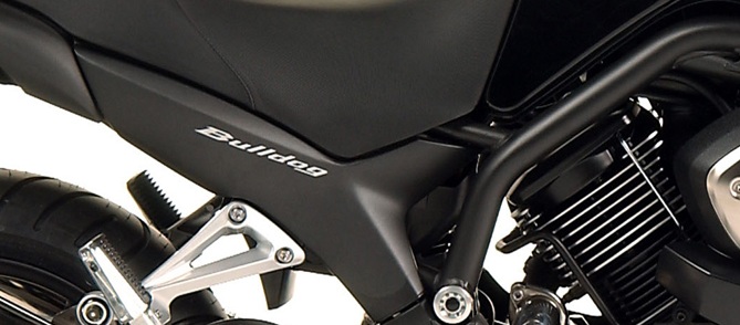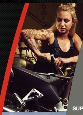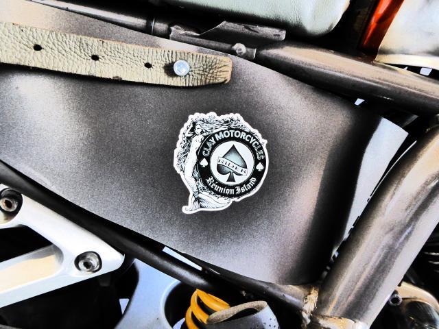 -si tu veux bien considérer que l’affiche pompe une des bécanes cultes de Claymotorcycles : le Yam BT 1100 Bulldog (alias mon Storm Cruiser à moi). Les hasards des banques d’images sûrement. Ou l’influence de mon stand de 2015? Ah, ah ! Une fille tatouée serre un écrou imaginaire sur le cadre. Et, pour avoir pas mal démonté et viré du plastoc dans ce coin là, je peux vous garantir qu’il n’y a pas grand chose à visser dans ce secteur.