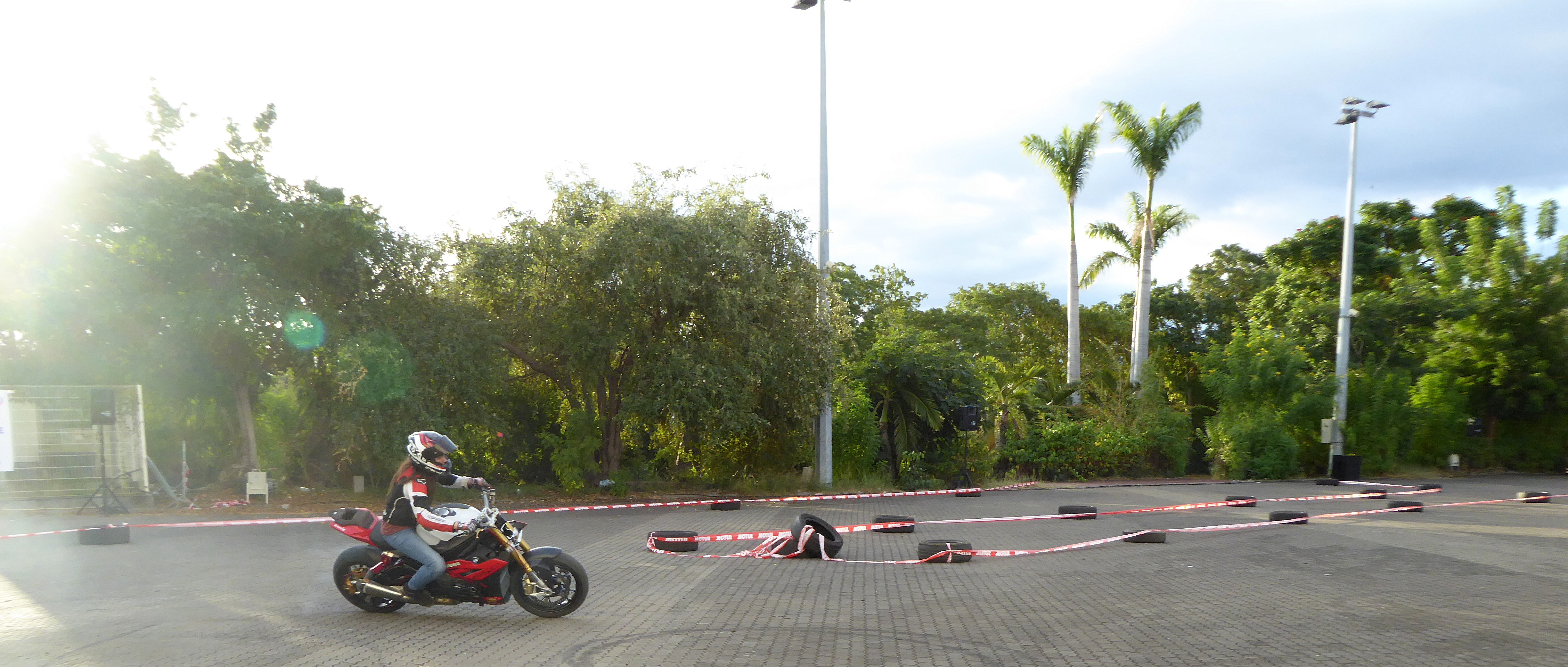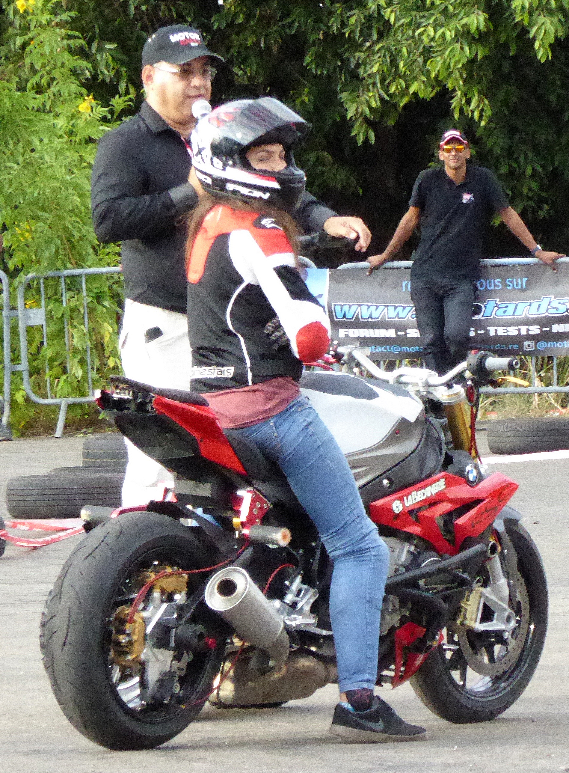 -si tu veux voir Julien de Motards.re, un gars qui se démène vraiment énormément, en plus de son taf, pour faire bouger la moto dans tous les sens sur l’île (on dirait moi à mes débuts, mais moins obsédé par le custom et avec une barbe!), si tu veux le voir, donc te disais-je, se livrer à une gestuelle étrange sur la piste, à mi-chemin entre le taï-chi et le break dance !