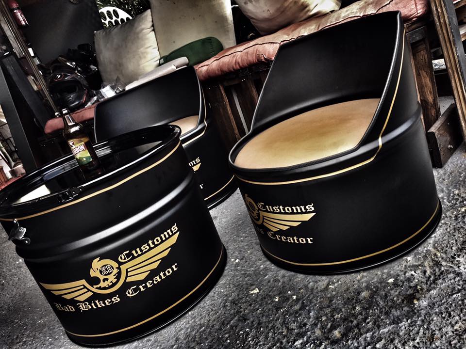 -si tu veux voir des machines bien plus accessibles, authentiques, et vraiment sur-mesure (pas juste personnalisables avec des accessoires de catalogue) notamment chez des artisans comme Vincent, le préparateur de XR-Custom, ou comme Calvin le graveur de Black Barts. Ces deux-là, je vais bientôt leur consacrer un nouveau post. En attendant, allez donc vous asseoir dans un des super fauteuils en bidons réalisés par XR.
