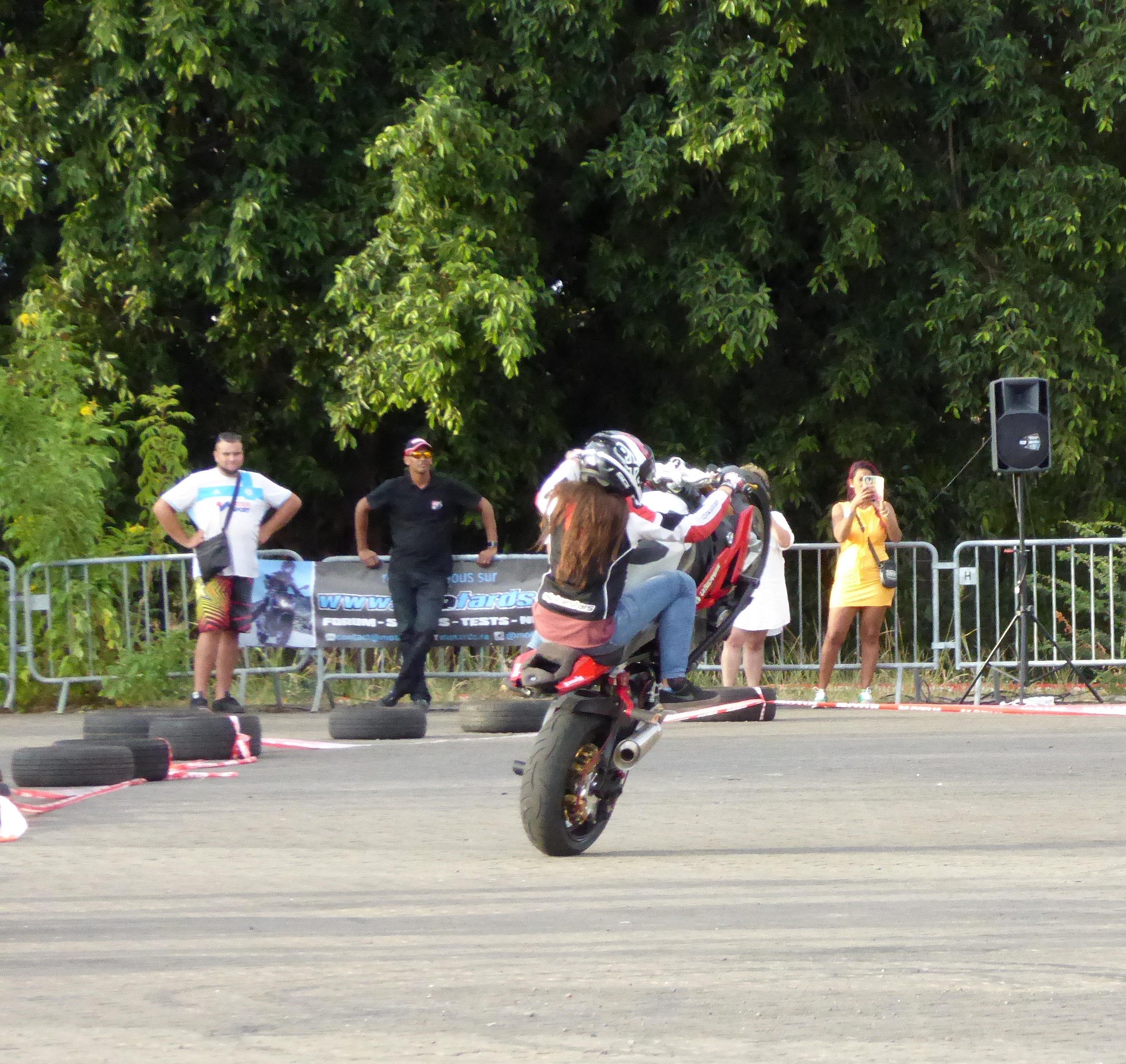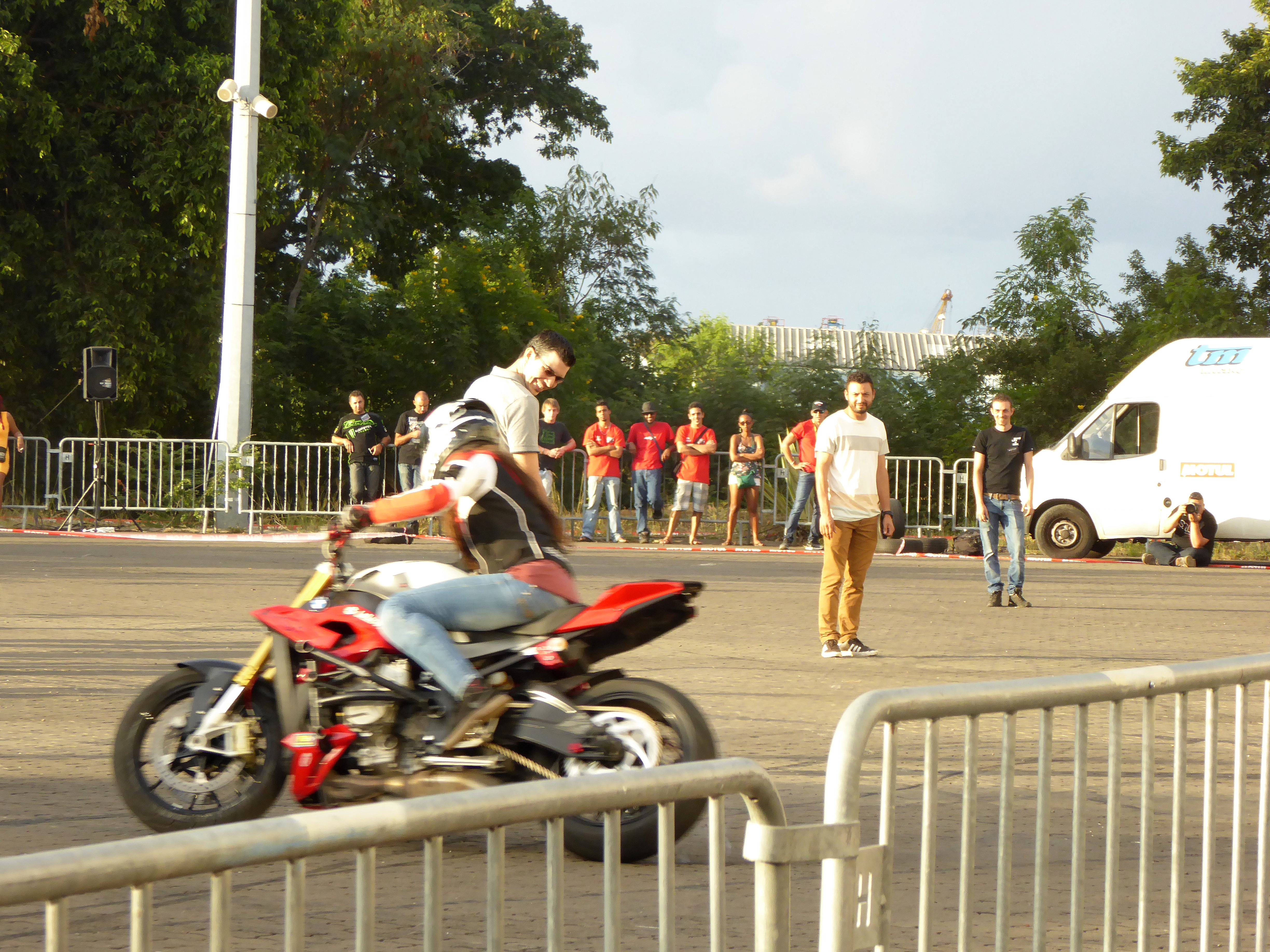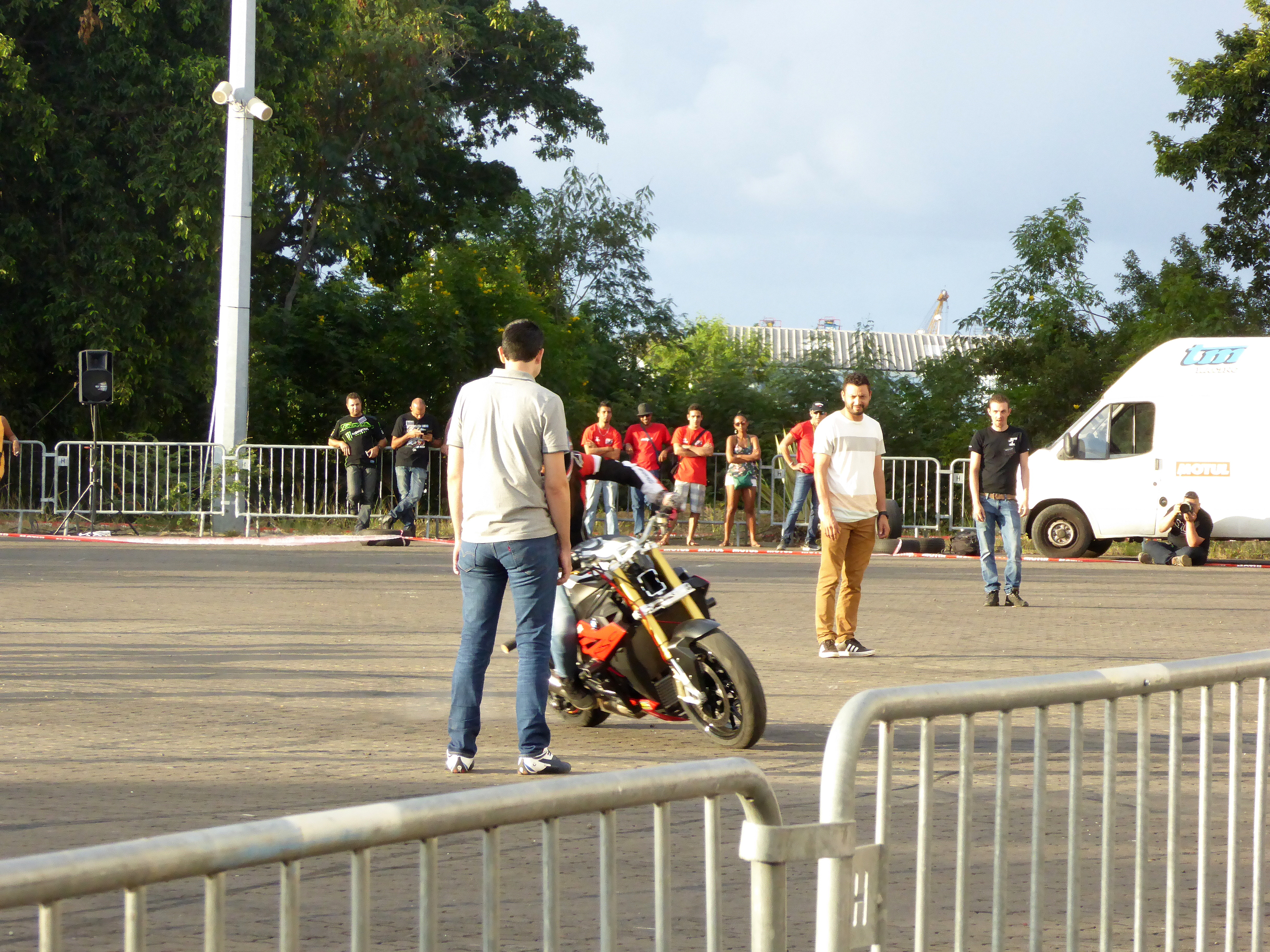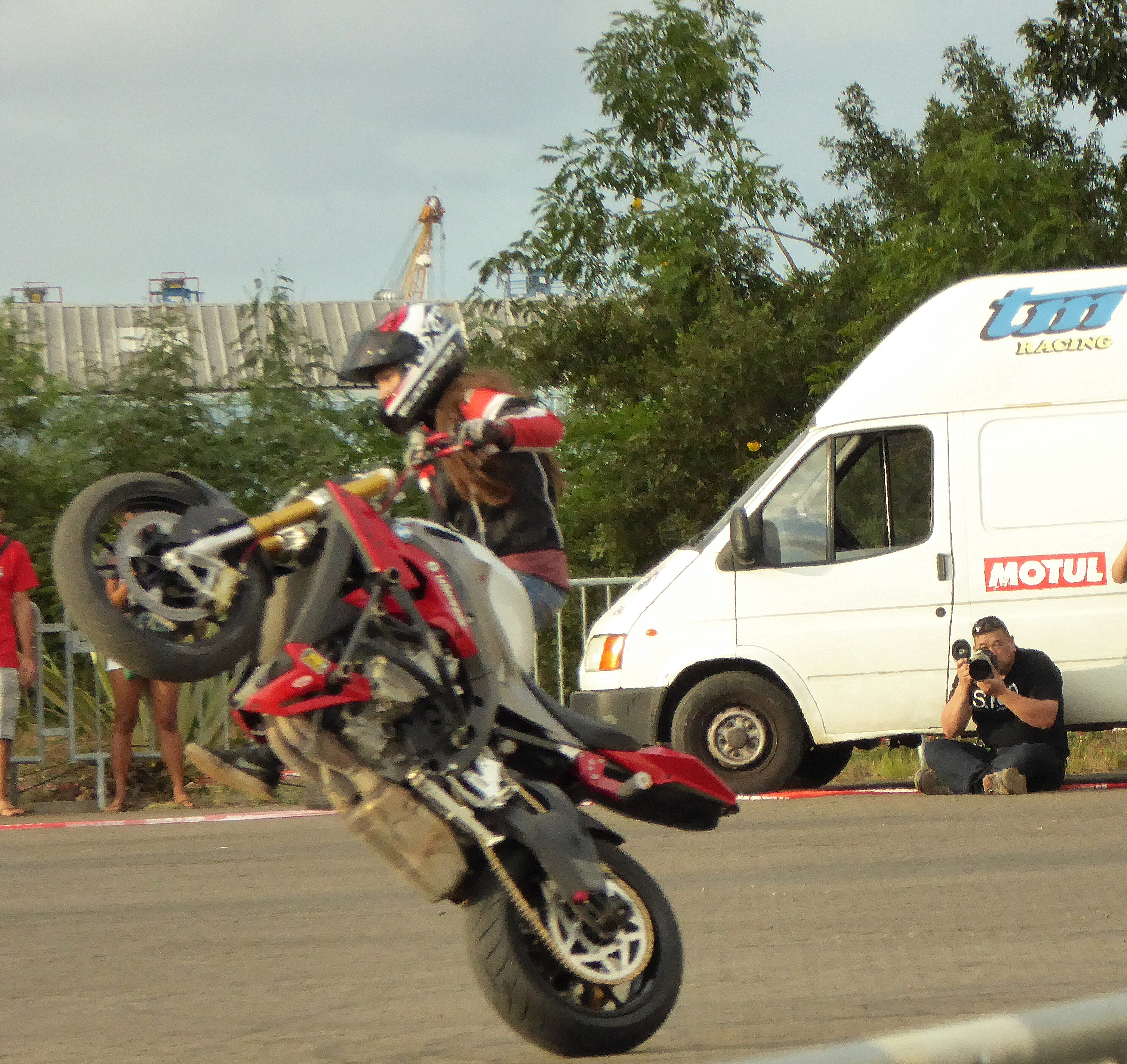 -si tu n’as pas trop de sous. 6 euros l’entrée et 3 pour les petits, ça va. Pour ce prix-là, tu vois la Championne du Monde de stunt en action, et quand le kid sors son tel pour filmer le show, tu te dis que la mission est accomplie. Tu peux même amortir ton billet d’entrée en te payant une HD ou une Bavaroise à plusieurs patates. Elle est pas belle la vie au Port ? Par contre, le vestiaire payant, ça rappelle la bonne époque des discothèques, mais 1 euro pour le casque, et un autre pour le cuir, pour deux personnes, c’est un peu mesquin et ça t’inciterait presque à venir en tee shirt et bob Paul Ricard. Nous, on s’en foutait : on devait garder le matos sur le dos pour faire de l’autopromotion au Blog.