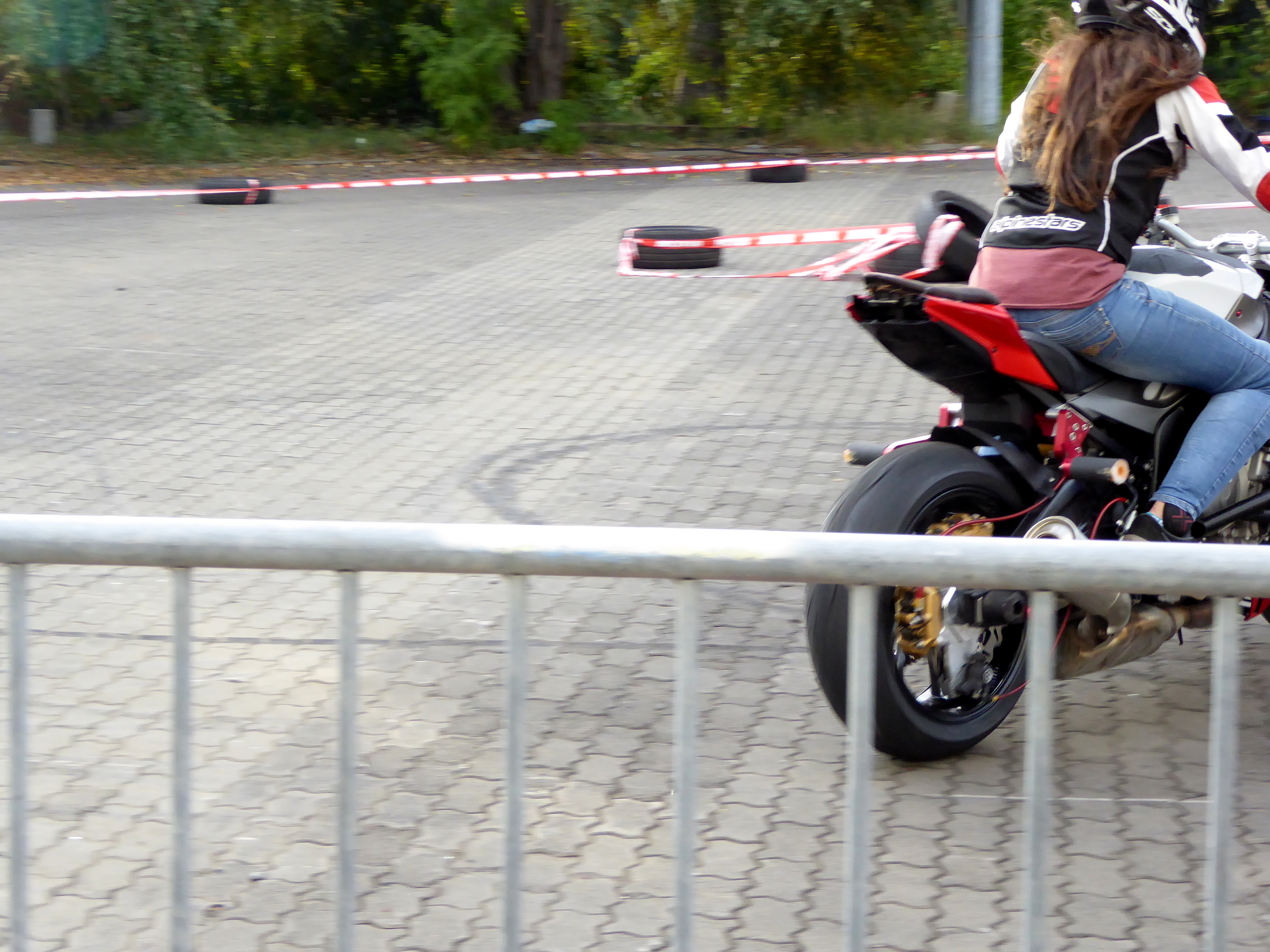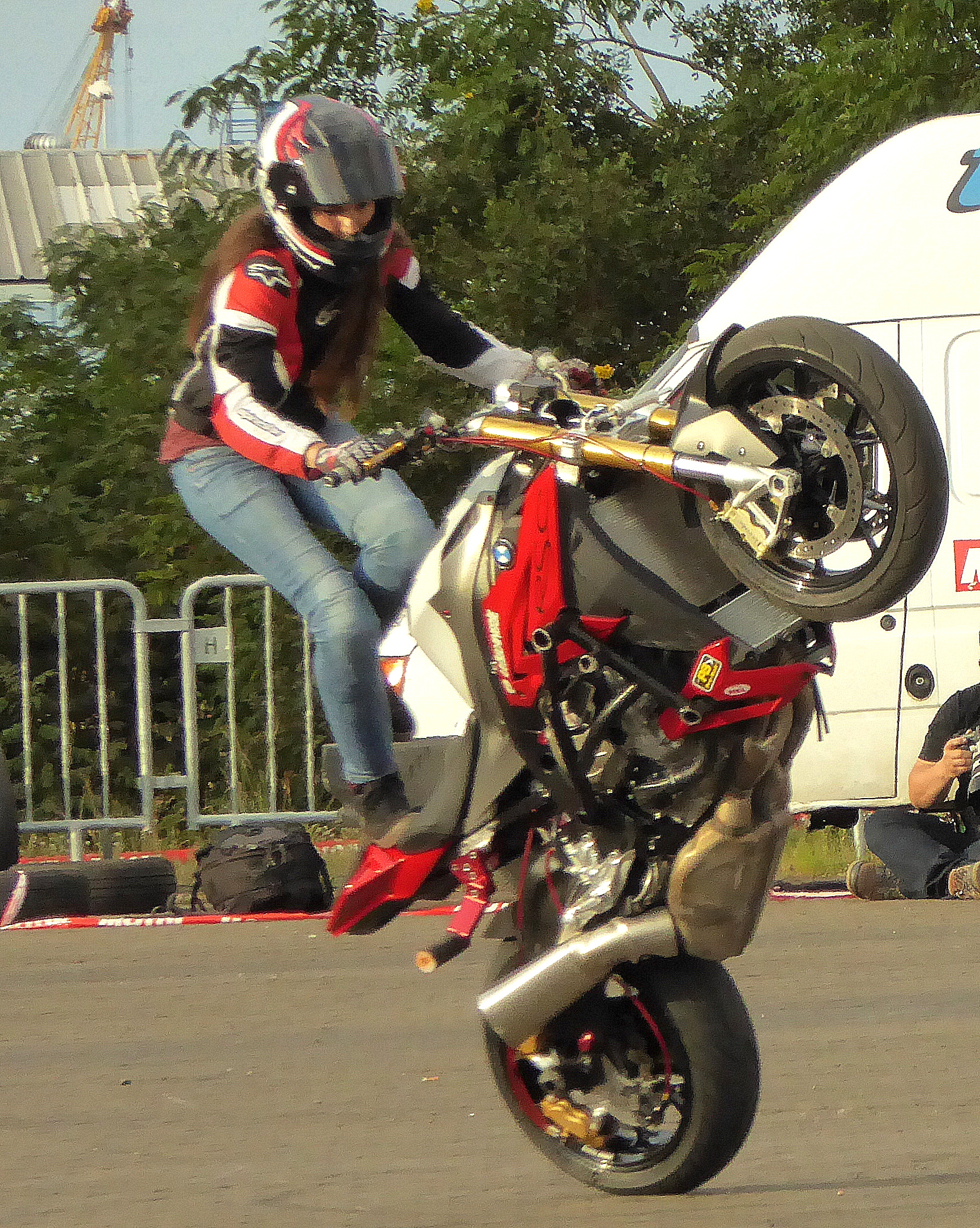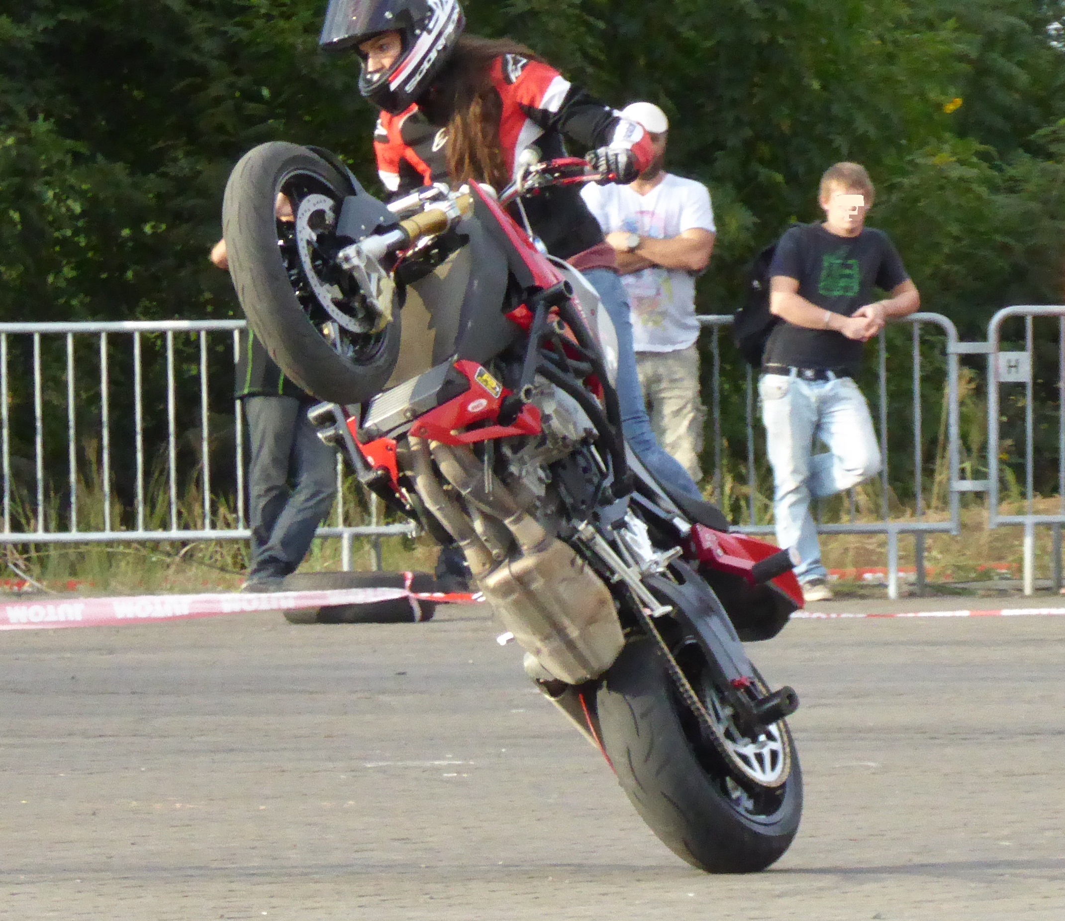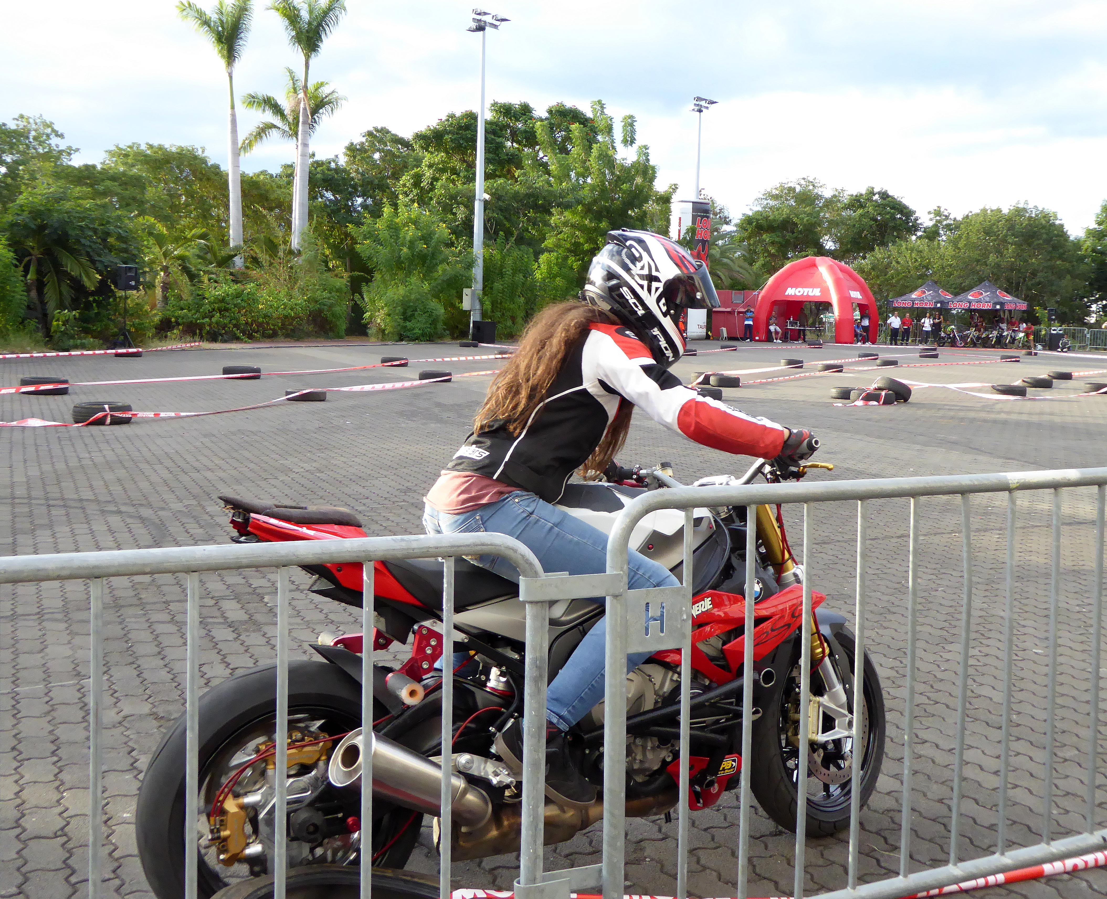 -si tu n’as pas trop de sous. 6 euros l’entrée et 3 pour les petits, ça va. Pour ce prix-là, tu vois la Championne du Monde de stunt en action, et quand le kid sors son tel pour filmer le show, tu te dis que la mission est accomplie. Tu peux même amortir ton billet d’entrée en te payant une HD ou une Bavaroise à plusieurs patates. Elle est pas belle la vie au Port ? Par contre, le vestiaire payant, ça rappelle la bonne époque des discothèques, mais 1 euro pour le casque, et un autre pour le cuir, pour deux personnes, c’est un peu mesquin et ça t’inciterait presque à venir en tee shirt et bob Paul Ricard. Nous, on s’en foutait : on devait garder le matos sur le dos pour faire de l’autopromotion au Blog.