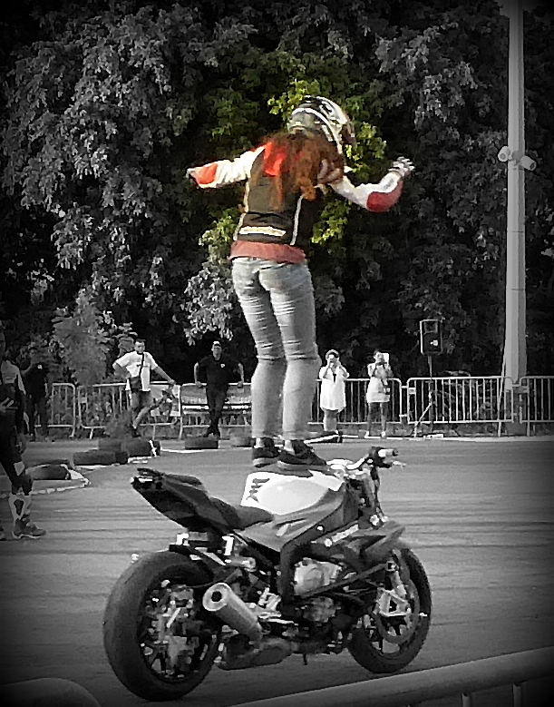 -si tu veux voir la Championne du Monde de stunt, Sarah Lezito. J’aime bien le stunt. Tout d’abord, les motos de stunt sont toujours assez destroy. J’aime ça. Et puis le stunt résumes assez bien la moto et sa passion. Un peu de frime. Une prise de risques calculée. Le goût de la puissance. L’hédonisme individuel conjugué avec le sens du partage. Une sauvagerie totale concentrée sur la maîtrise d’une haute technicité. C’est tout cela Sarah, mais avec du fun, de la grâce et ce je-ne-sais-quoi de jamais vu chez un stunter mec. Le lendemain, des potes de potes me la décrivaient encore comme la petite amie idéale ! Je ne regardes plus le foot depuis le Mondial 98. Mais l’autre soir, j’ai regardé la finale de foot féminin PSG/Lyon. J’y ai découvert de la classe, du fair play et de l’engagement. Peu d’arrêts de jeux. C’était bien plus stylé que chez les gars. Idem avec la petite princesse Sarah. Ce qui est certain, c’est que cette sportive cool et modeste déchire grave total. Hélas, à cause de problèmes de durites pétées ou de système de refroidissement foireux (la bécane avait déjà été réparée la veille, et là elle est sortie discrètement avec de la fumée blanche qui sortait des carters), pas de burnn final! Frustration ! Chauffés à bloc, on se termine aux applaudissements après un wheeling… Du coup, je n’ai pas pu montrer à Raph ce que c’est qu’un pneu qui fond littéralement sur place dans un enfer de fumée et de bruit. Pas grave : ce sera l’occasion d’y retourner demain 😉